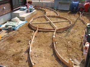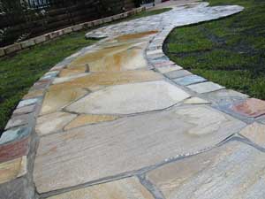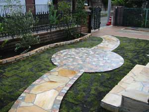 テラスとアプローチには、色の違う4色の石英岩を使用しましたので変化があり、アールを基調にしたデザインなので柔らかい感じに仕上がりました。