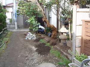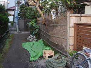 前回は穂垣でしたが、今回は建仁寺垣にしました。既存のザクロを切らなくてもいいように、垣根を細工しています。