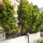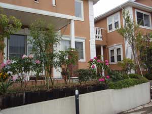 海沿いのお宅はこの様なケースが多いです。シャクナゲ、カルミア、細葉ヒイラギ、フイリアベリア、シマトネリコで建物に合う様にデザインしました。色が入り大変喜んで頂けました。