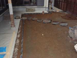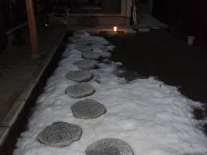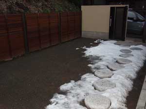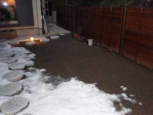 アプローチは根府川石、犬走りは茨城の砂、蹲組みは鳥海石でシンプルにまとめました。モミジの葉が芽吹き苔が青々してくると、更に美しくなる事でしょう。素材にこだわり、楽しみながら作庭させて頂きました。