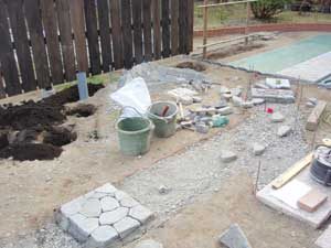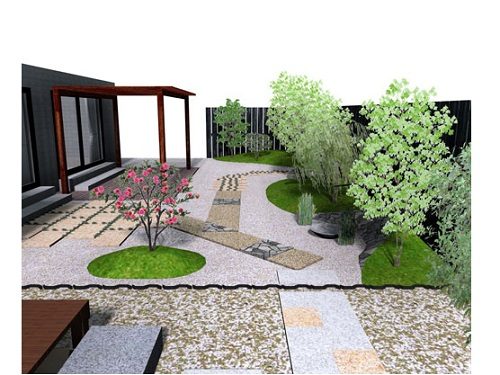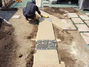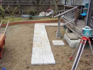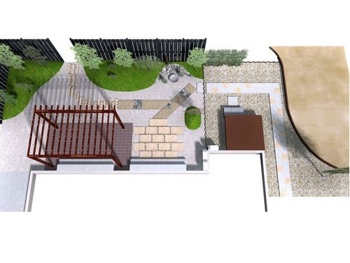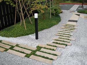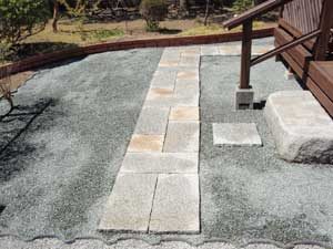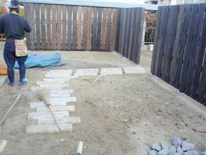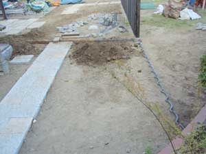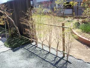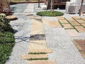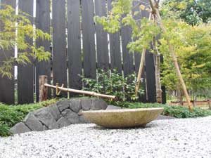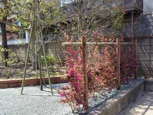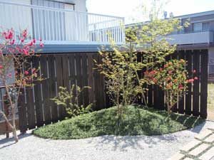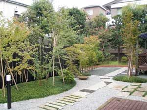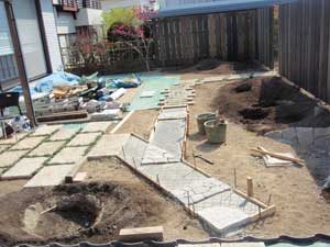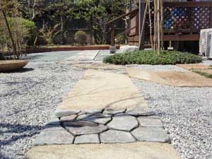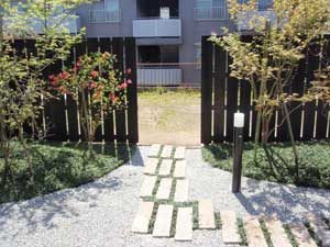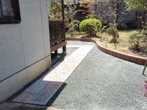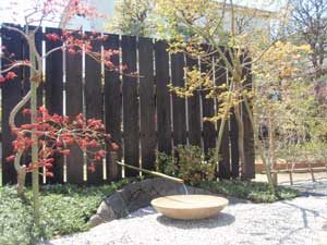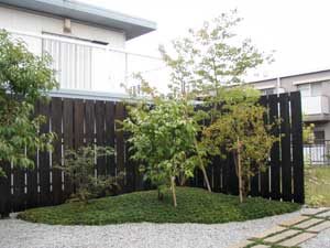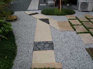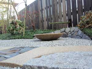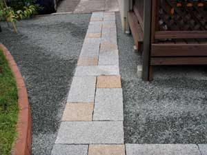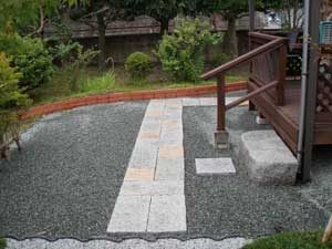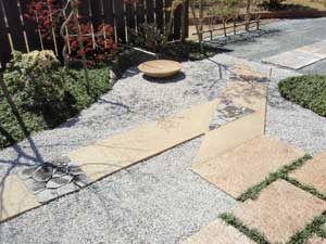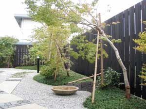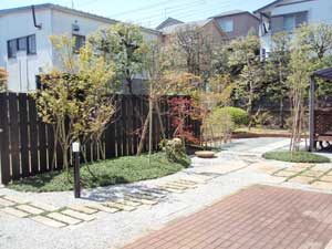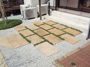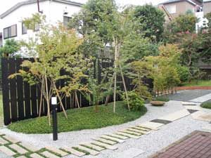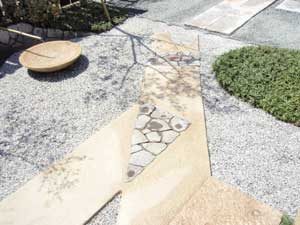 板塀は国産檜を使用し、茨城の砂で洗い出しを施工しました。 リビングから見える所に水景を配し、アプローチの素材とラインにこだわりました。 大変喜んで頂きました。