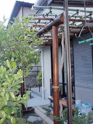 藤は白、紫と色分けしたのでコントラストが楽しみです。テラスは国産古レンガを使用しているので、良い風合いです。喜んで頂けました。