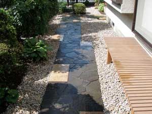 段差がなく、歩き易い鉄平石のアプローチをご提案させて頂きました。建物の周りは錆砂利を敷き雑草を抑えています。
