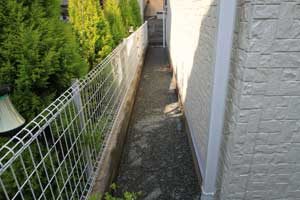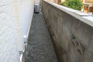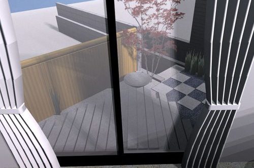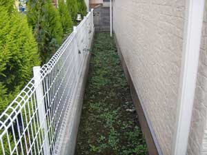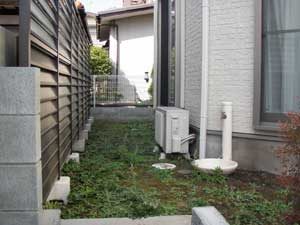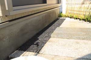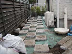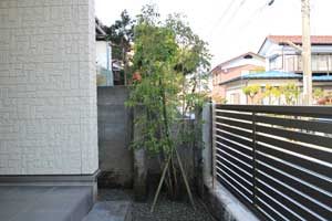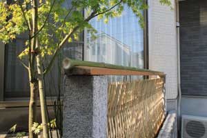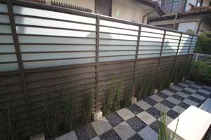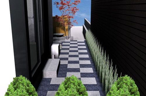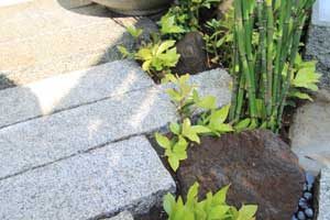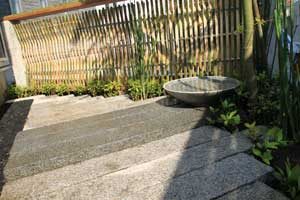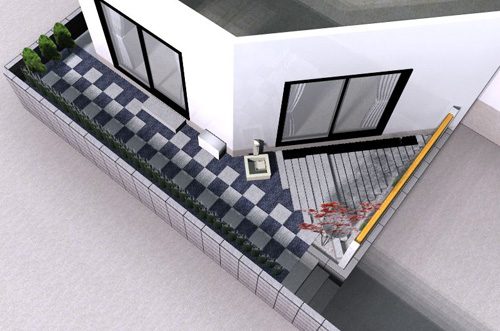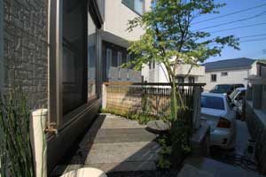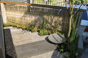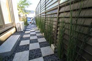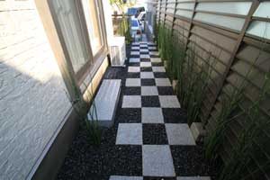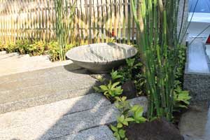 見て楽しむ庭にして欲しいとの依頼でした。垣根の素材にもこだわりモダンな感じにして、大きめのトクサと白御影石を使った市松敷きのアプローチでシンプルに仕上げました。水盤に小鳥が遊びに来ると楽しいですね。大変喜んで頂けました。