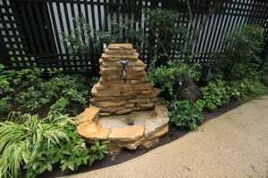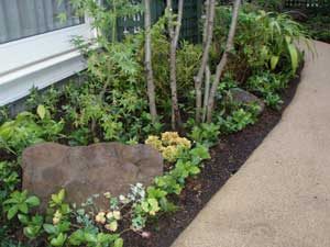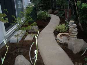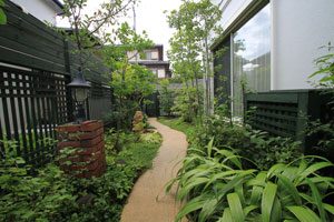 山の中に居る様な雰囲気で、なるべく造り込みはしたくないとの事で雑木と山野草と山道風のアプローチで構成しました。アプローチには土を混ぜて、なるべく柔らかい感じになる様な仕上げにしています。ライトも入れたので夜の景色も楽しんで頂けます。