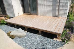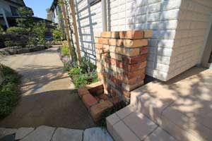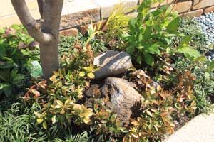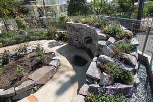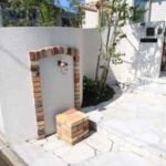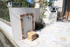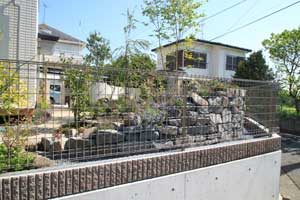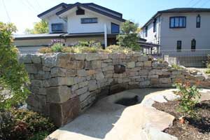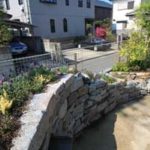 外構も含め、外周りも全てうちのデザインでまとめました。 ほとんどお任せでデザイン、施工をさせて頂きましたので、壁泉は小松石、花壇は美濃石を使い、素材や工法にもこだわっています。 石積みから出た樋石から水が流れ出て、小鳥も集まり、花も季節ごとに楽しめるように工夫しています。 木材も国産檜材を使用し、建物周りも土を叩いてしめています。 これからは水音を聞きながらお庭で楽しんで頂ける事でしょう。