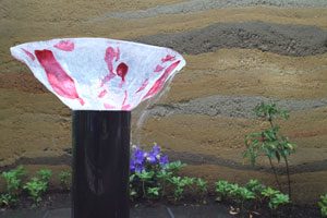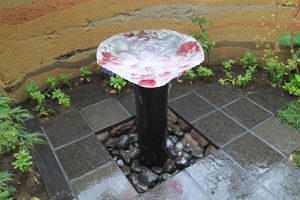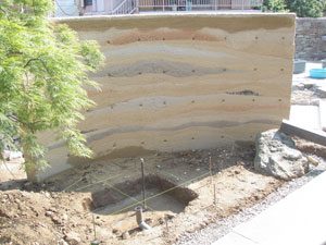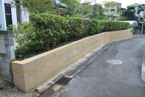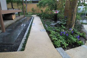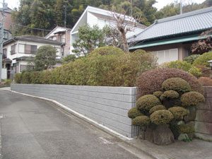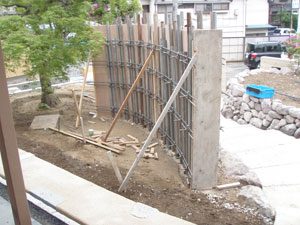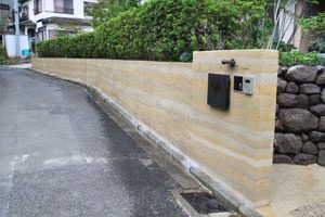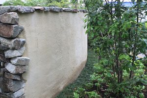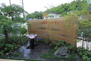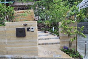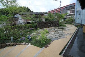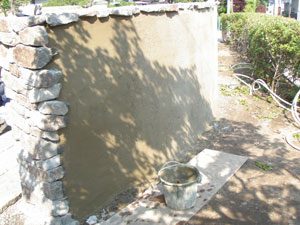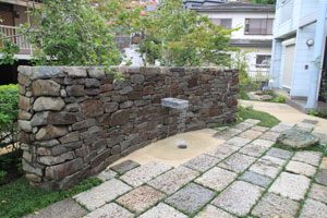 工事を開始して暫くして、あの3.11の震災が起き、燃料も満足に給油できない状態で重機が使用できず大変でした。 手の込んだ「こだわりの空間」をという事で、外壁も既存のブロックを生かし版築工法で化粧しました。 それに合わせて門柱も土で制作し、オリジナリティーを出しています。 石材は石積に神奈川の赤ボサ、壁泉に小松石を使用し、水を景色に取り入れました。 リビング前は、外壁とは土と配合を変えたやわらかい土壁を背景に、特注のガラス製の鉢から水が湧きあふれます。 小さなお子様もいらっしゃいますので、石積みの壁泉からあふれた水を下に溜めれる様にして、夏は水遊びが楽しめます。 今まで何十年も使用されていなかった井戸をポンプでくみ上げ、復活させましたので水は冷たく気持ちがいいです。 また、主木のモミジは山堀りの木で、柔らかくいい雰囲気です。 これから、木々が根を張り下草類が増えてきますと、更に良くなる事でしょう。