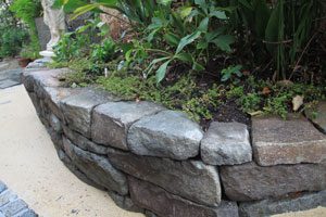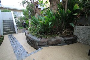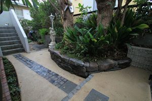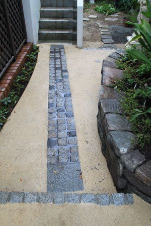 既存の材料は生かし、洗い出しと小松石の小端積みでモダンな雰囲気を出しました。シンプルですが、ラインや色彩にも気を使いました。葉山の街の雰囲気に合う景色です。