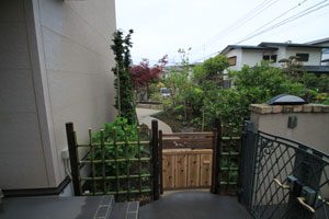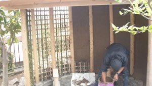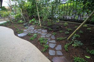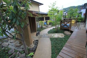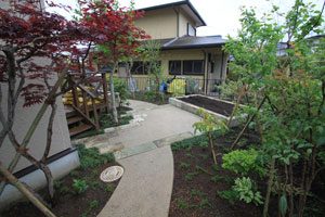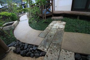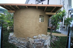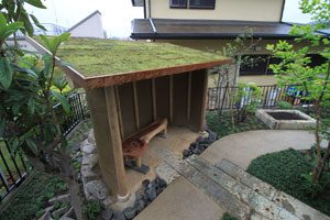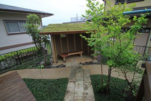 大谷石の古材で菜園を作り、洗い出し仕上げのバリアフリーの道で結びました。 畑仕事の後は一息つける東屋を作り、欅のベンチ、壁は小舞を組み土壁とし床は三和土、屋根は苔を貼りました。 全て天然素材で構成しましたので、手触りも経年変化も味があり、夏も涼しく過ごせます。 庭の風景にも溶け込み、ここで畑仕事の後心地よい風を感じながら休憩して頂ける事でしょう。 また渋柿も植えましたので、秋には軒先に干し柿も吊るされ、それも風情がありますね。大変喜んで頂けました。