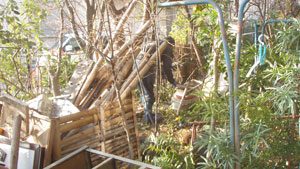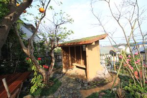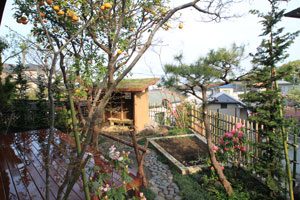 人が多く集まるとの事で、大きめのデッキをプランに取り入れました。菜園作業の後に、草屋根、土壁の小屋で心地良く、くつろいで頂ける事でしょう。 アプローチには川玉石、石積みには赤ボサ石を使用しました。 また、この現場は「週刊ジョージア」と言う番組の取材を受けた、心に残る現場となりました。
