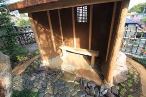 No.160 草屋根、土壁小屋のある庭 川玉石 赤ボサ石