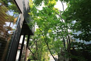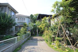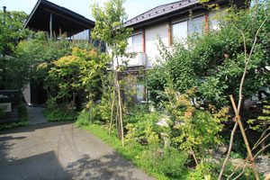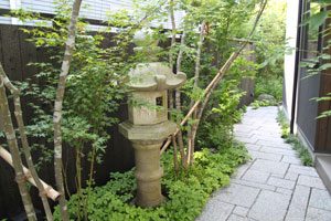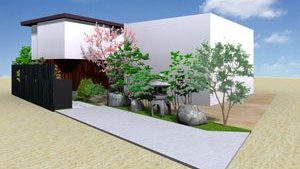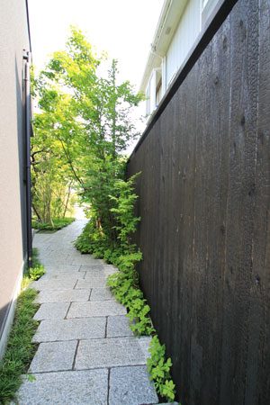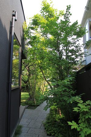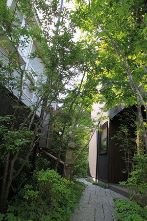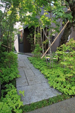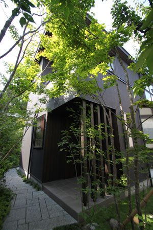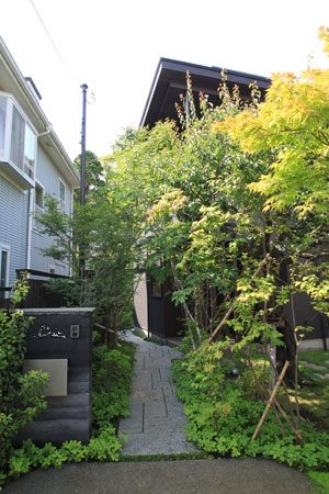 「庭屋一如」という言葉の通り、鎌倉の歴史深い街並みにも違和感なく溶け込む様に意識し設計した空間は、モミジ、トネリコ、ナツハゼなどの雑木を多く植え、玄関までの道のりが緑のトンネルとなり、季節により変化する色や影や線を楽しんで頂けます。また黒を基調にデザインされた建物にも合うように焼杉板塀、黒白のグラデーションの版築門柱、白御影石のアプローチなどモノトーンの素材で構成しています。