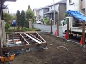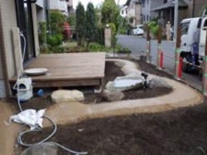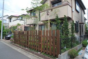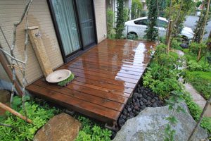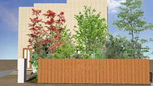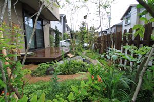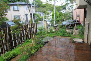 お庭のリフォームのご依頼で、ウッドデッキがあり、鳥の集まる様な庭にしたいとのご希望のもと設計しました。また、道行く人々にも楽しんで頂きたいとの事で、パーテーションも最低限の視線を遮るデザインにしました。