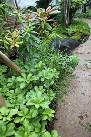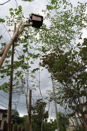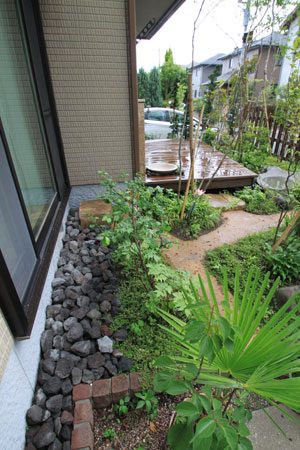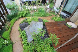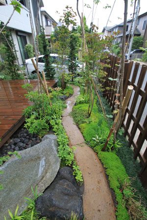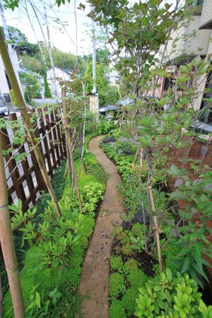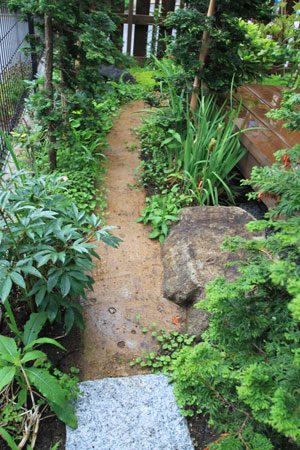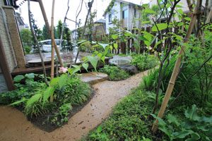 限られたスペースを最大限に生かせるようにデザインし、山の中に居るかの様な雰囲気を出すように、自然の土の道(三和土)で山道をつくり、モミジやトネリコなどの雑木類を植え、バードバスの水場(白御影石の水盤)もつくりました。巣箱を設置して間もなくシジュウカラが巣をつくりに来てくれ、大変喜んで頂けました。