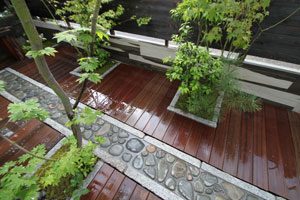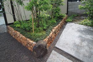 お寺の山門の脇にあり、鎌倉市の保存樹が玄関前にあるという条件を生かす様な構成にしています。現場からでた鎌倉石をアプローチに再利用し、古瓦等で組み、鎌倉の古い街並を壊さない様にかつ現代住宅にも合う様なデザインにしています。植栽の石積みにはみかも石、玄関までのアプローチ、ウッドデッキのデザインに川玉石を使いました。 また参拝者からの視線をぼかすような植栽を心がけました。時が経ち、木々が茂って来るのが楽しみです。