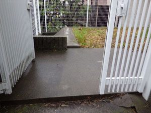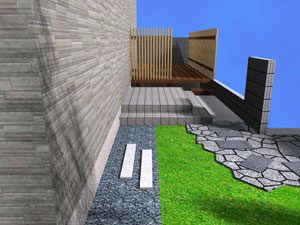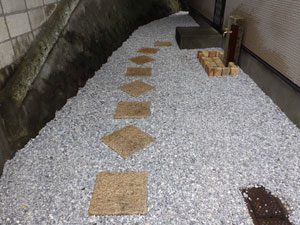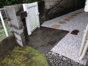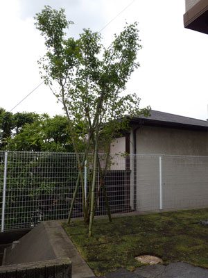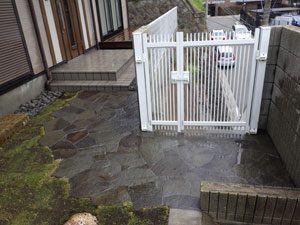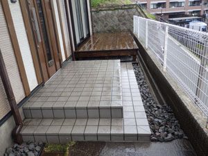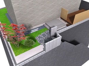 ご希望通りのシンプルな構成で、芝を中心にデッキと鉄平石の石張り、植木はもみじ一本のみでまとめました。これから日本での生活を庭と共に楽しんで頂ける事でしょう。