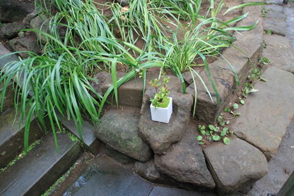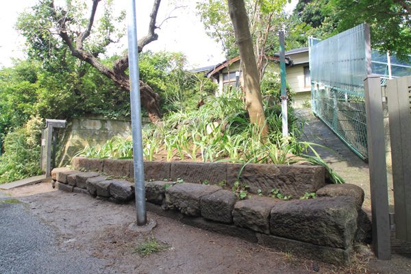 ブロックなどを使用するのではなく、建築との時代の調和を考え、うちでストックしていた鎌倉石を使用しました。下草もこの地に自生しているシャガやユキノシタ、ヤブラン等を植えています。なじみやすくして築100年の古民家との調和を図り大変喜んで頂けました。