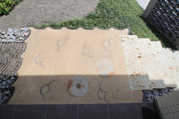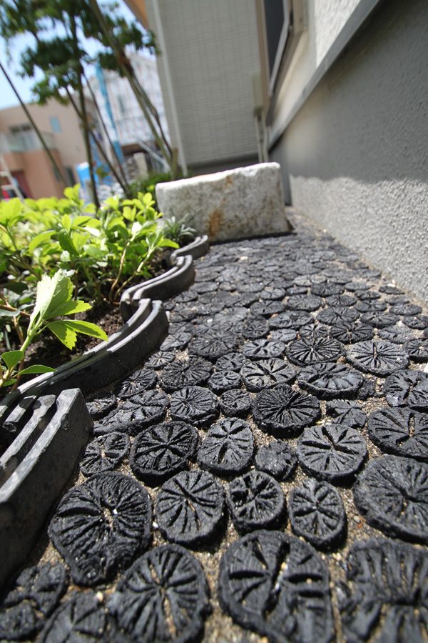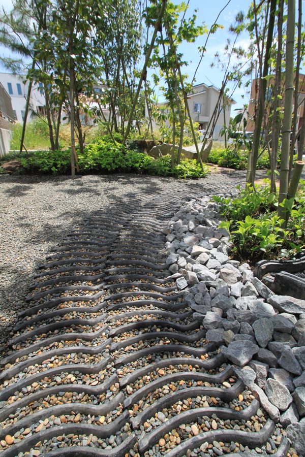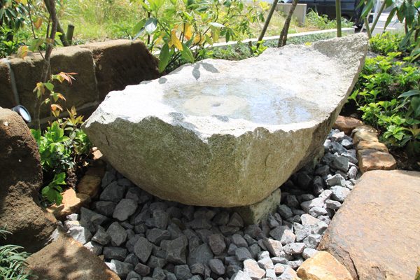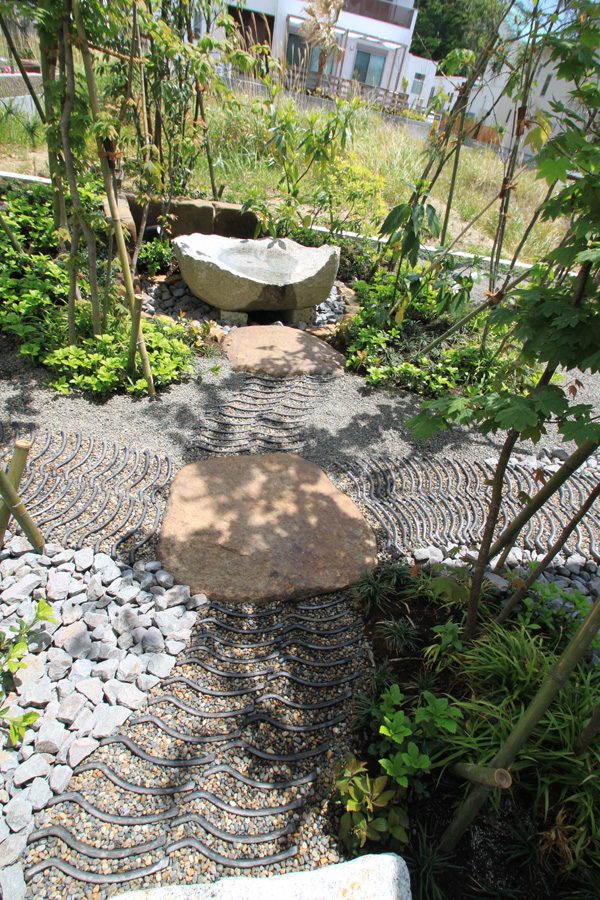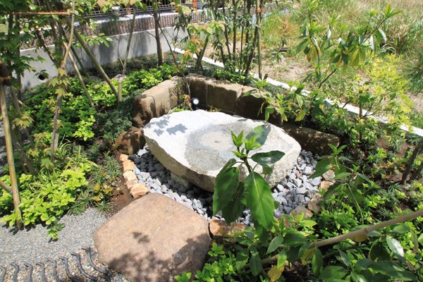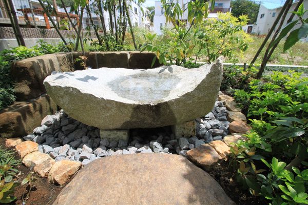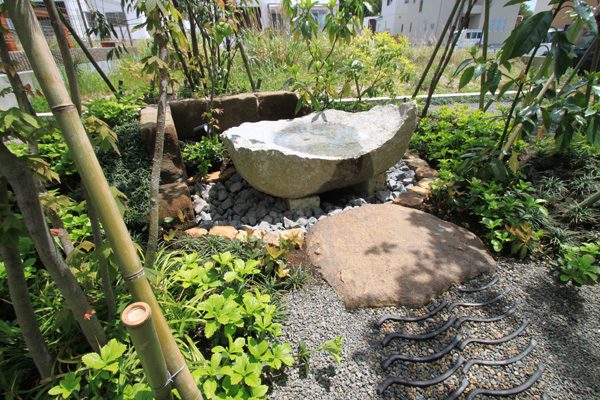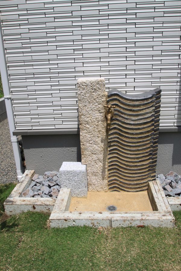 時間は掛かりましたが、細かい手仕事の積み重ねで、空間構成しました。赤ボサ石の石積みは昔ながらのコンクリートを使用しない野面積み工法で、排水が良いのでコンクリートを使うより強いです。大谷石の階段、古瓦を利用した水栓や門柱など、既製品にはない味わいとオリジナリティーです。見どころ満載で世界の方々が来られても、日本を感じて頂ける事と思います。