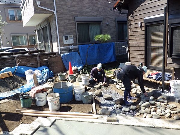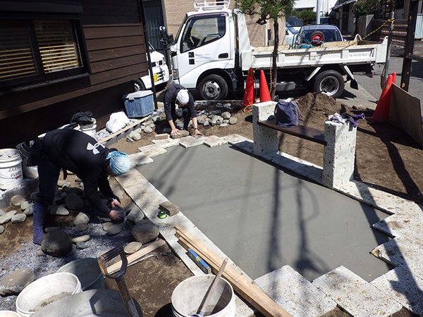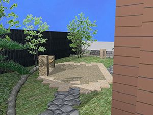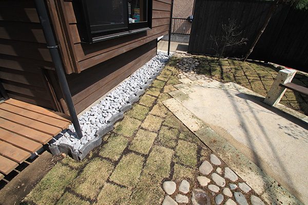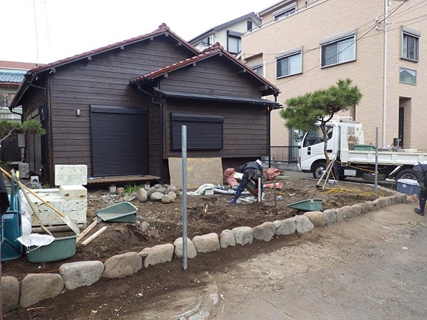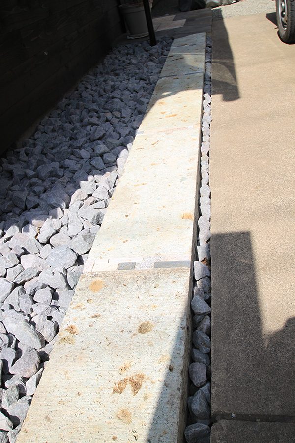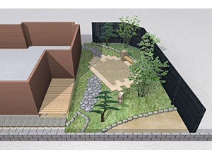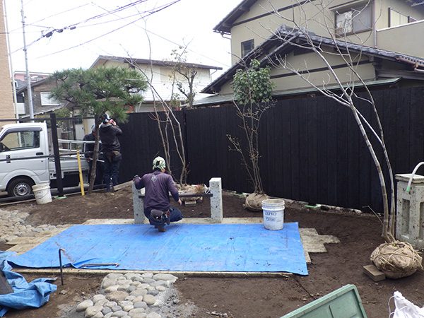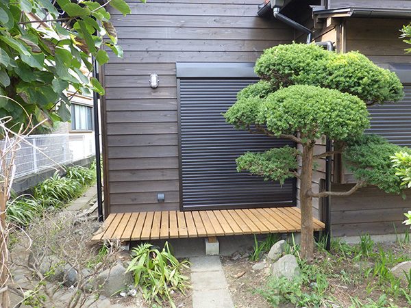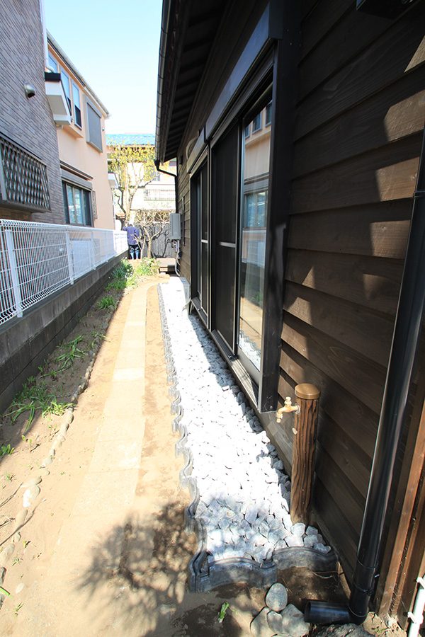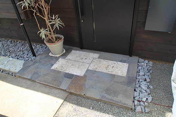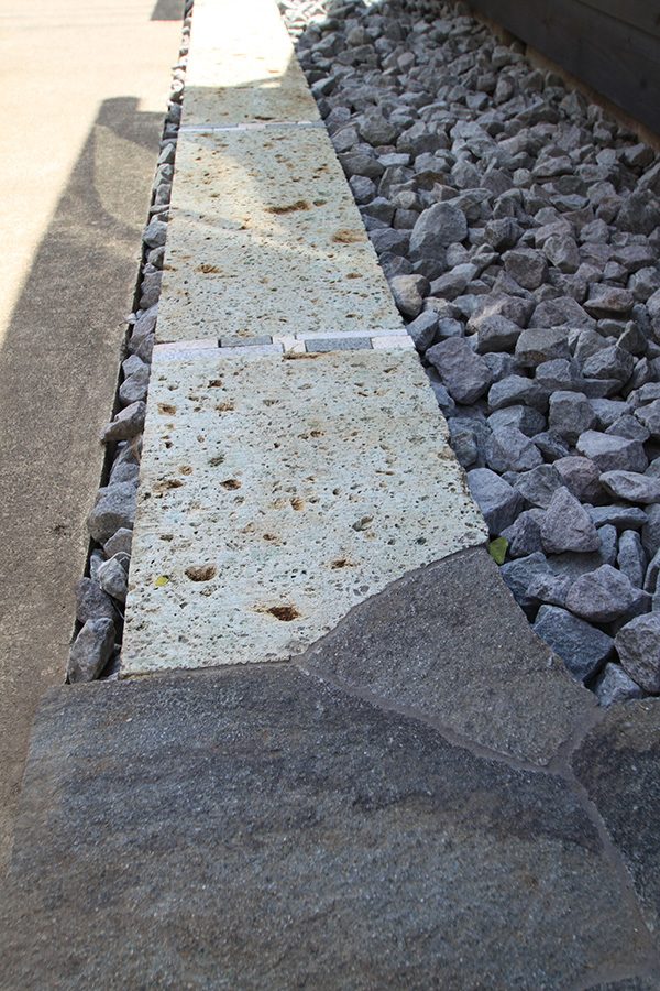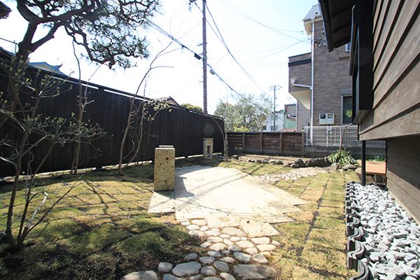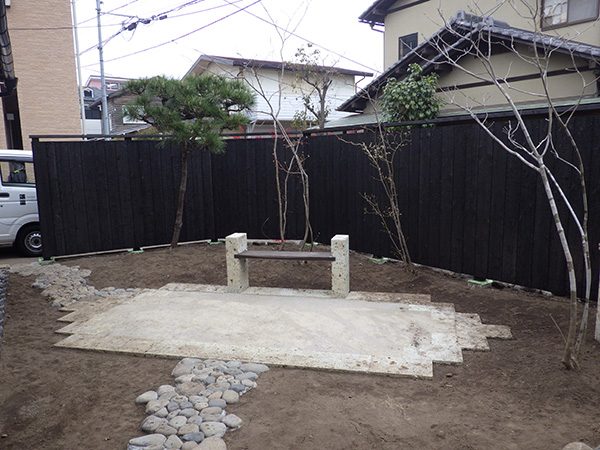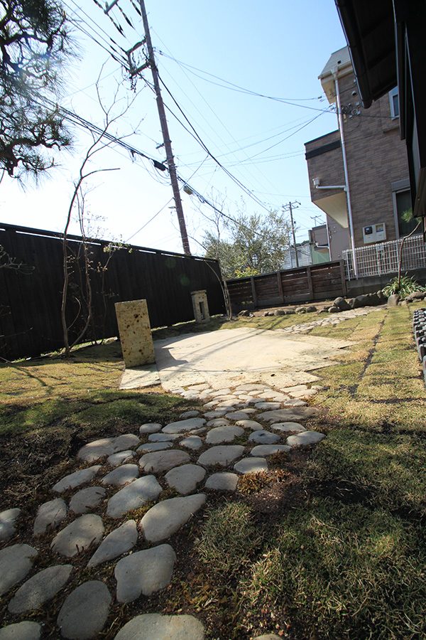 外回りを焼杉塀で囲い、建物との統一感を出しています。この地は玉石が多く出るので、川玉石のあられこぼしのアプローチや柔らかい質感の真砂土の洗い出し仕上げの大谷石テラスを設け、脇に夜も楽しめる様に大谷石製のオリジナルの照明を入れて、ご家族で楽しめるスペースとしました。松の多く残る土地柄ですので、残せる物は新しいプランに取り入れて地域との街並みの景観の調和を図っています。早速、お子様が毎日お水やりをして下さっているとのご連絡を頂きまして、当社としても嬉しい限りです。 テラス、ベンチ、照明:大谷石 玄関周り:鉄平石、大谷石 あられこぼしアプローチ、土留め:川玉石