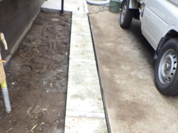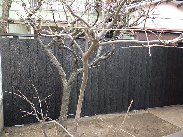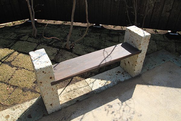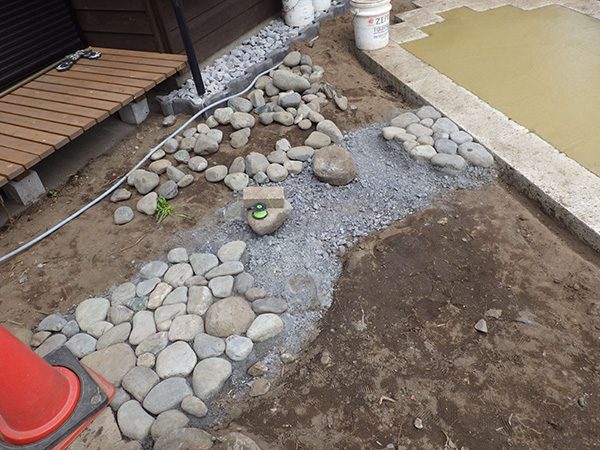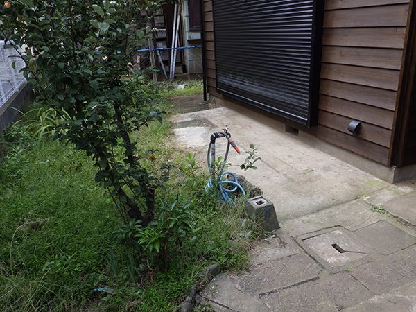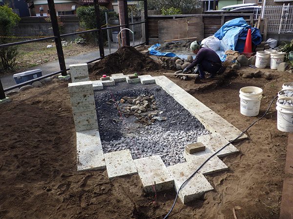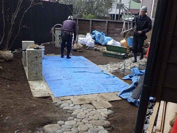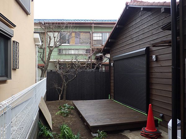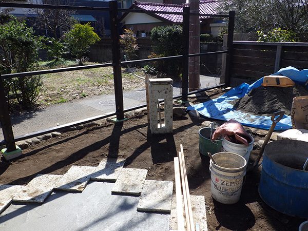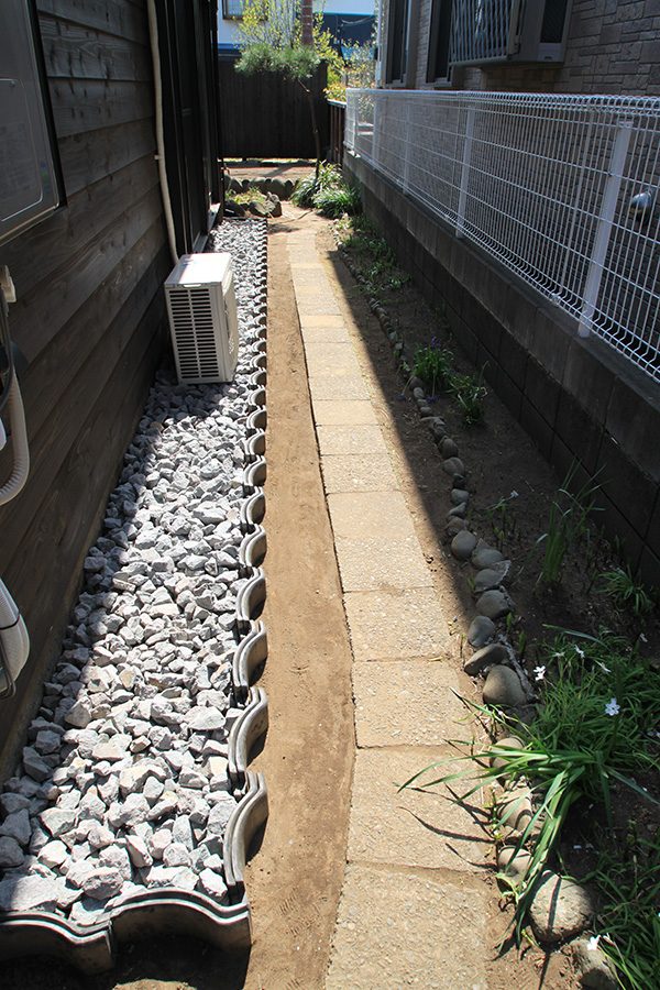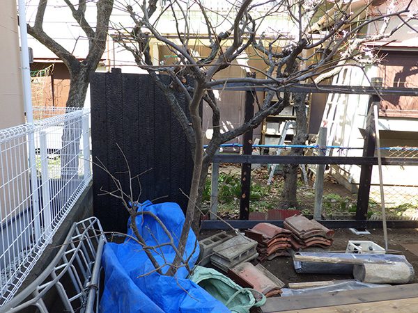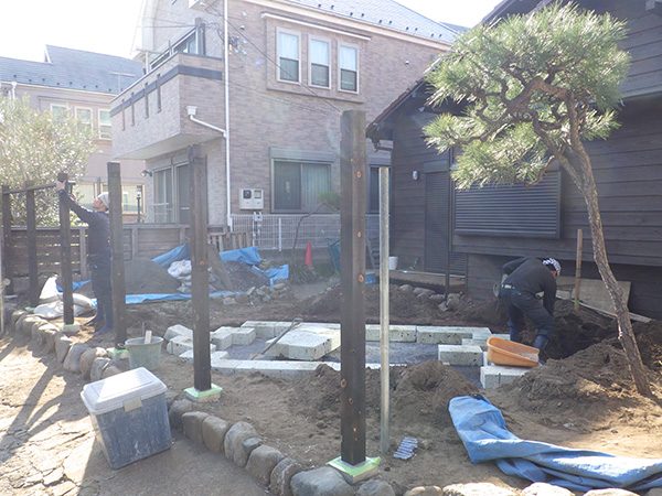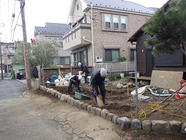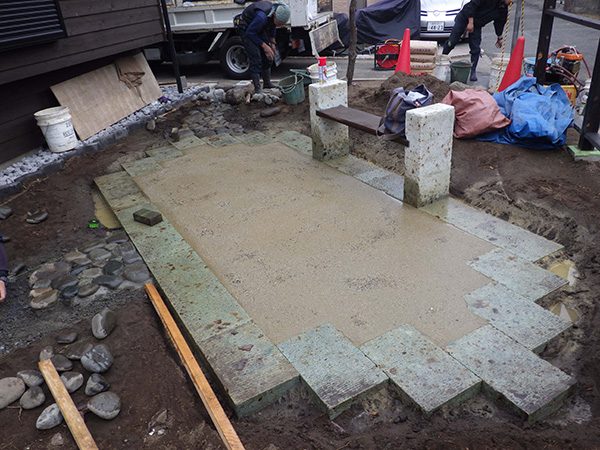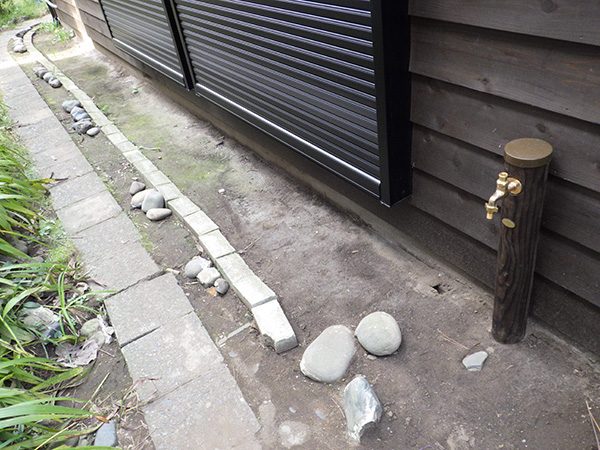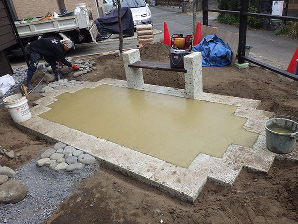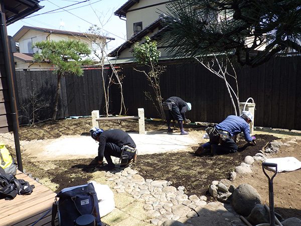 外回りを焼杉塀で囲い、建物との統一感を出しています。この地は玉石が多く出るので、川玉石のあられこぼしのアプローチや柔らかい質感の真砂土の洗い出し仕上げの大谷石テラスを設け、脇に夜も楽しめる様に大谷石製のオリジナルの照明を入れて、ご家族で楽しめるスペースとしました。松の多く残る土地柄ですので、残せる物は新しいプランに取り入れて地域との街並みの景観の調和を図っています。早速、お子様が毎日お水やりをして下さっているとのご連絡を頂きまして、当社としても嬉しい限りです。 テラス、ベンチ、照明:大谷石 玄関周り:鉄平石、大谷石 あられこぼしアプローチ、土留め:川玉石