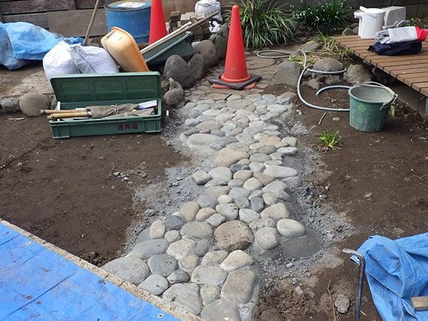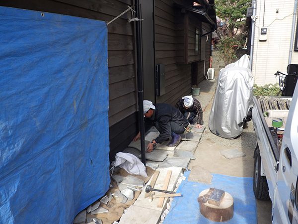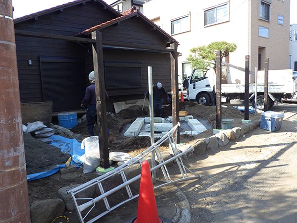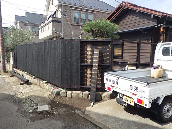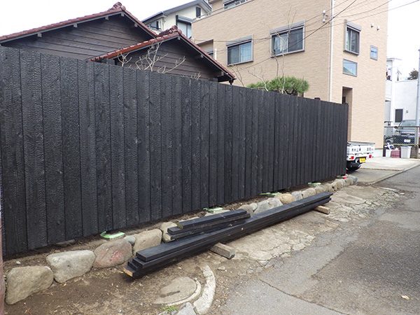 No.185 古民家リノベーションの庭 リガーデン 大谷石 川玉石 鉄平石 焼杉板塀