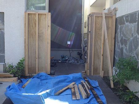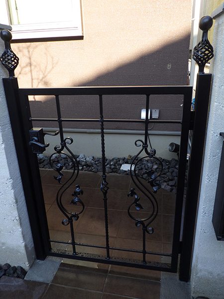 現代住宅にも溶け込む版築工法で門柱を作り、オリジナルのアイアン門扉で仕上げ既製品にはない、味わいのある玄関前を演出しました。