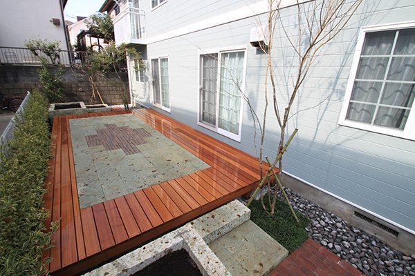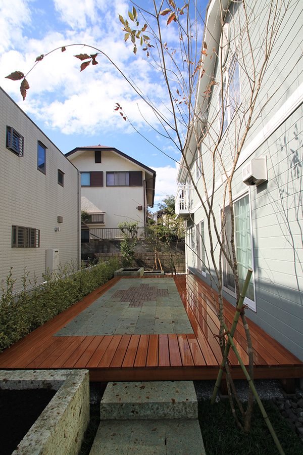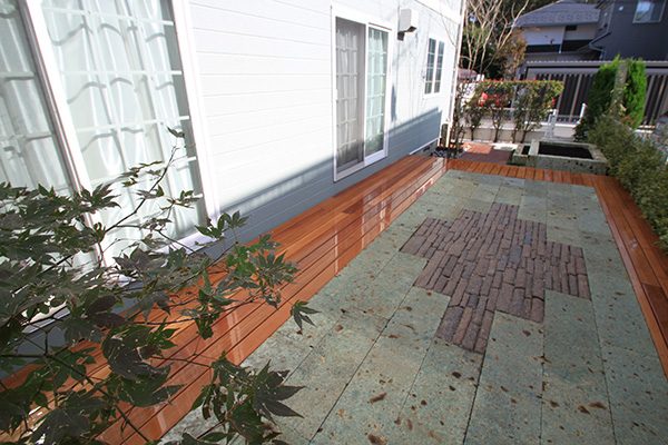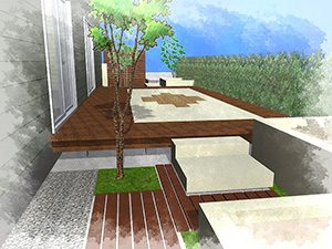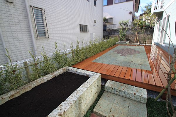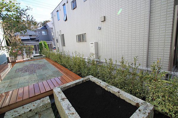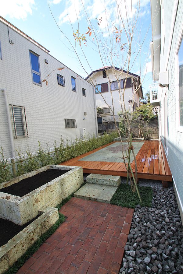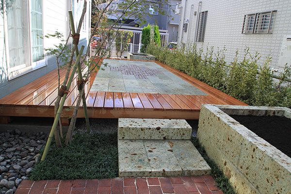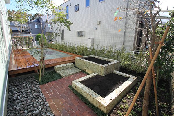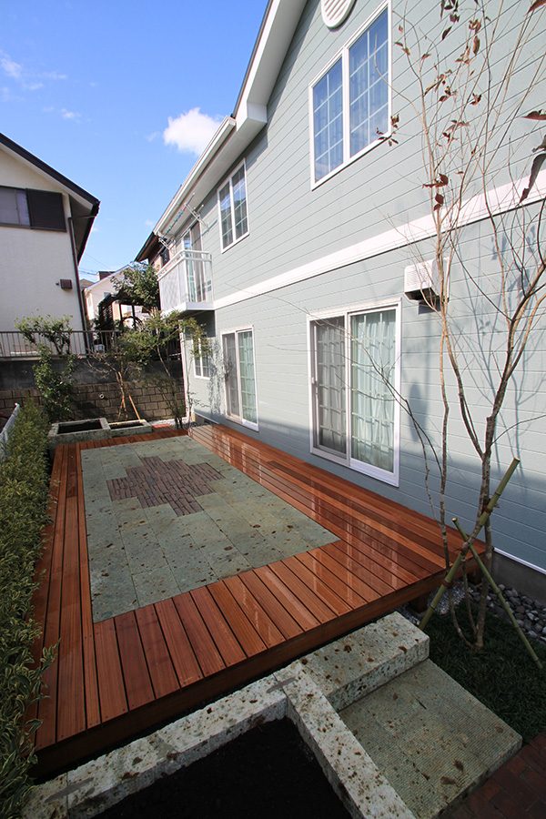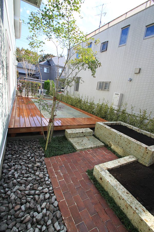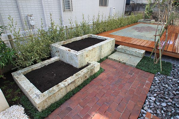 輸入住宅にも溶け込む様な外部空間を意識し、直線基調のデザインでモダンな感じのデザインをご提案させて頂きました。大きなテラスをご希望でしたので、単調にならない様に3つの素材(丹波石、大谷石、木材)を組み合わせて構成されています。必要最低限の家庭菜園(大谷石)を設け、リタイアされた後は心豊かな庭のある暮らしを楽しんで頂ける事でしょう。