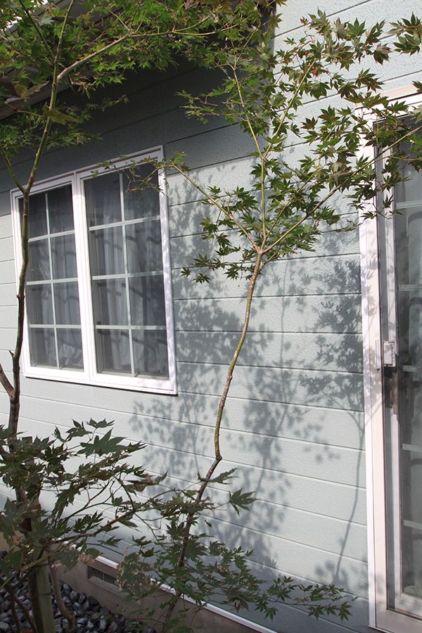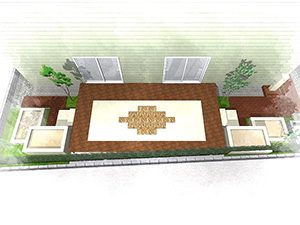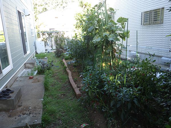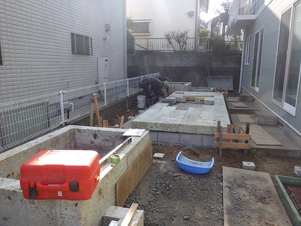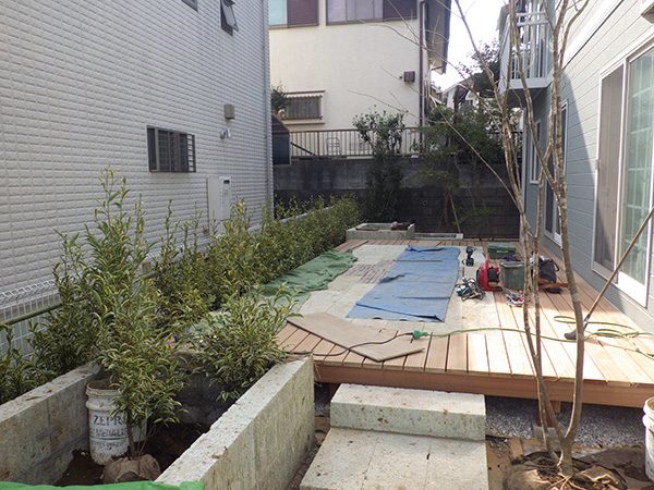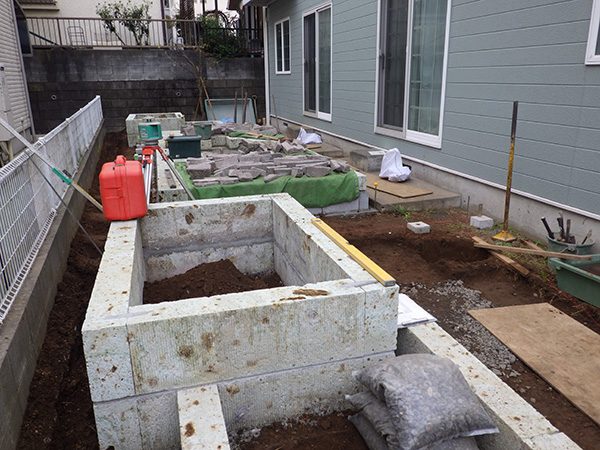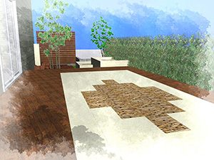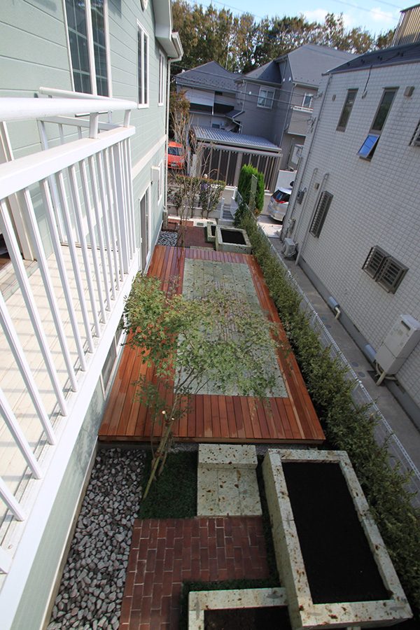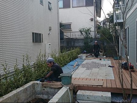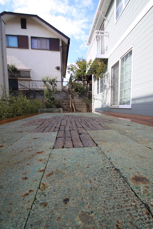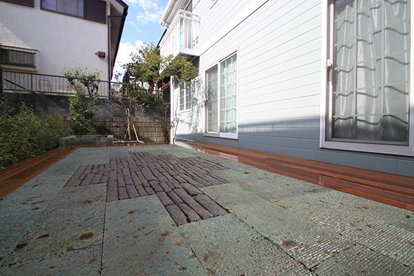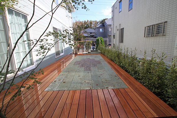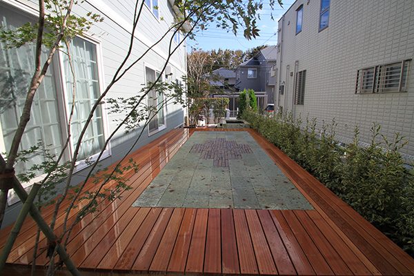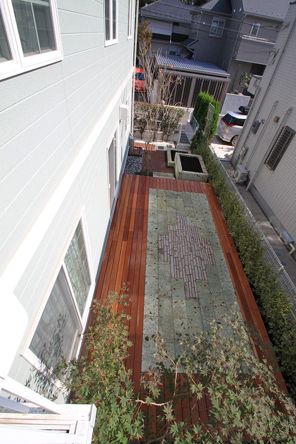 輸入住宅にも溶け込む様な外部空間を意識し、直線基調のデザインでモダンな感じのデザインをご提案させて頂きました。大きなテラスをご希望でしたので、単調にならない様に3つの素材(丹波石、大谷石、木材)を組み合わせて構成されています。必要最低限の家庭菜園(大谷石)を設け、リタイアされた後は心豊かな庭のある暮らしを楽しんで頂ける事でしょう。