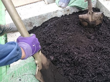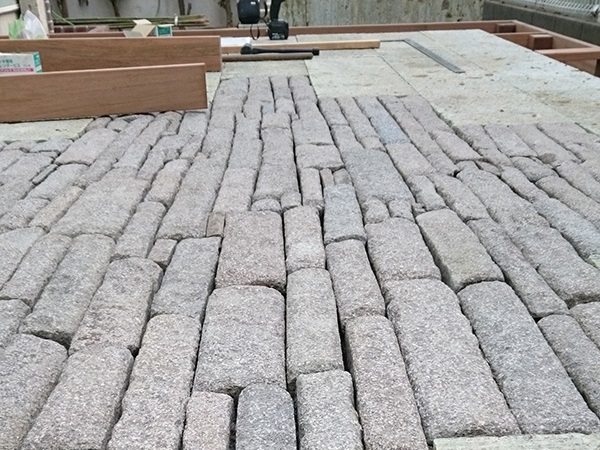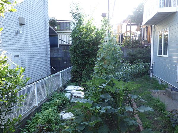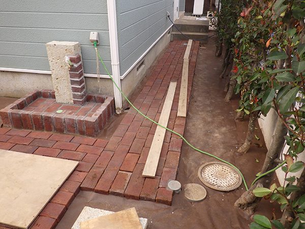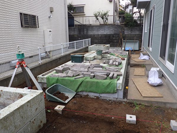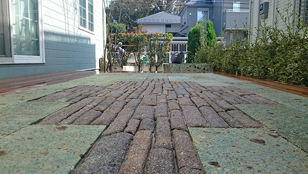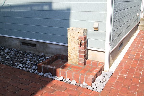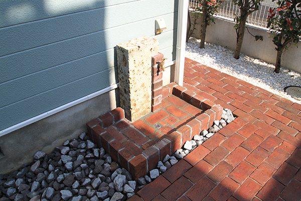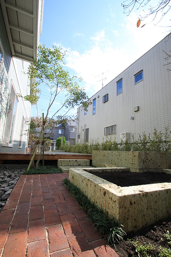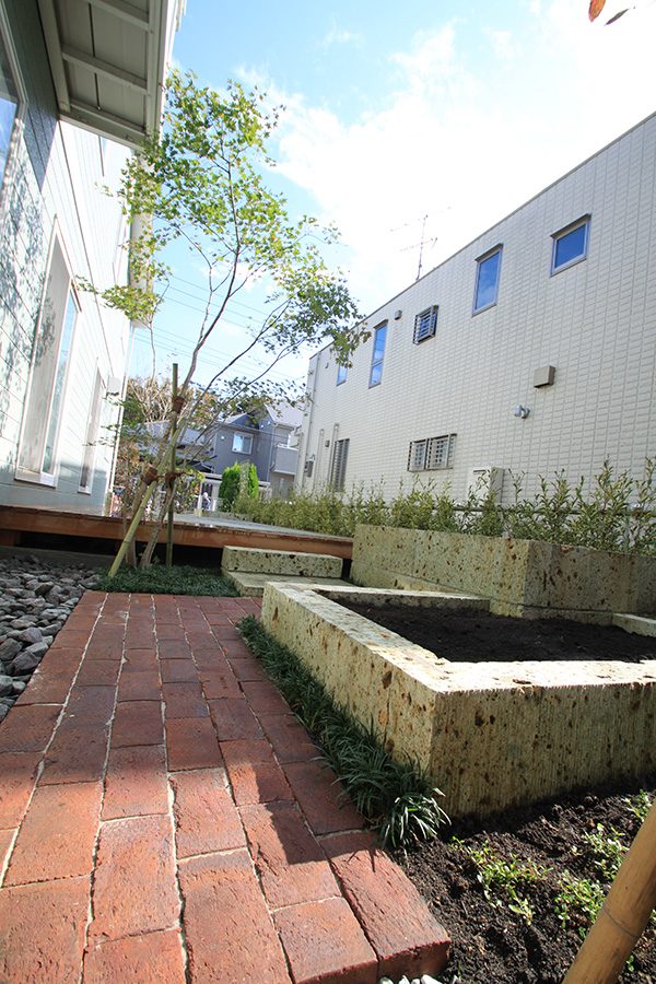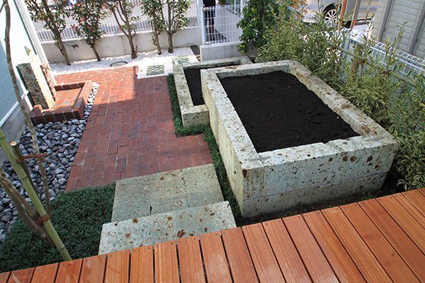 No.188 デザインテラスと菜園のある輸入住宅の庭 丹波石 大谷石 ベルギーレンガ