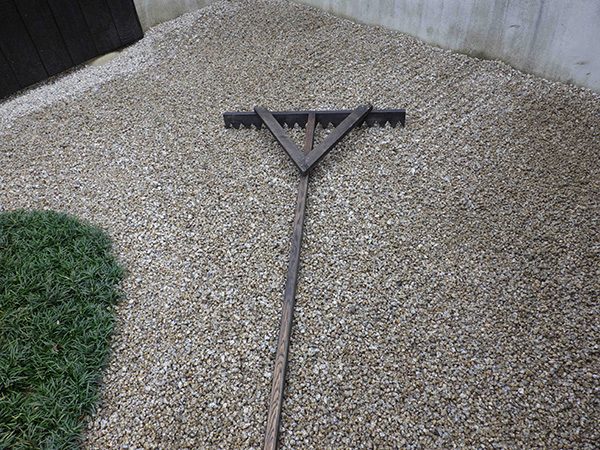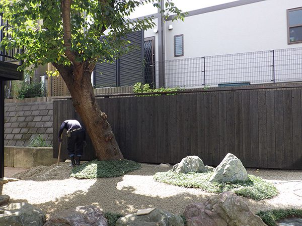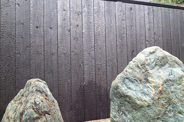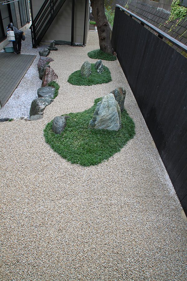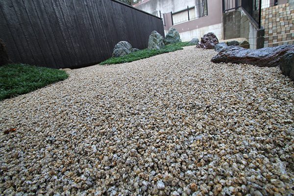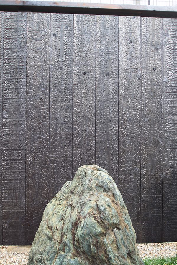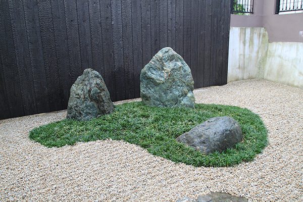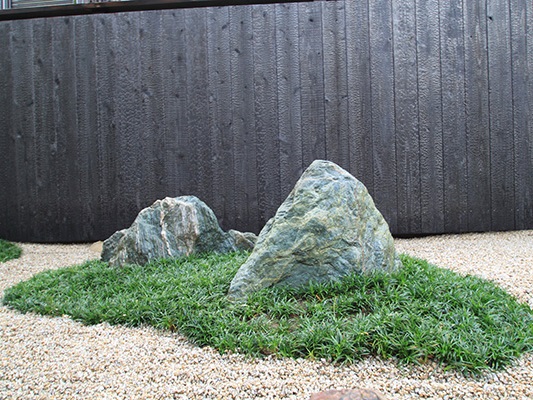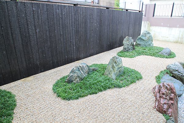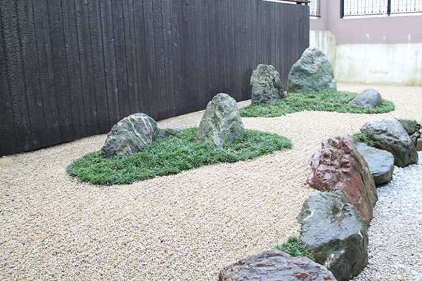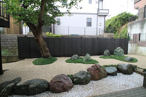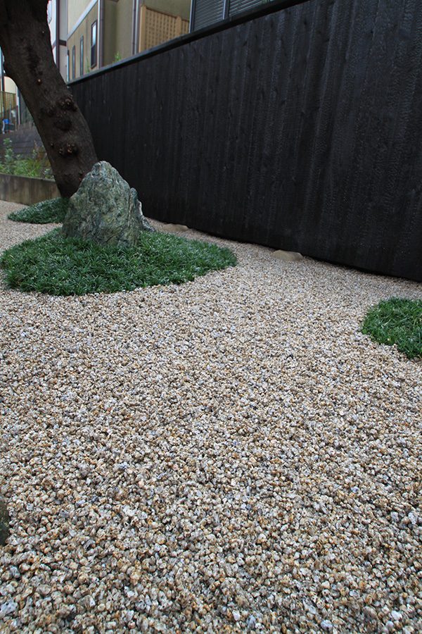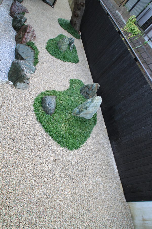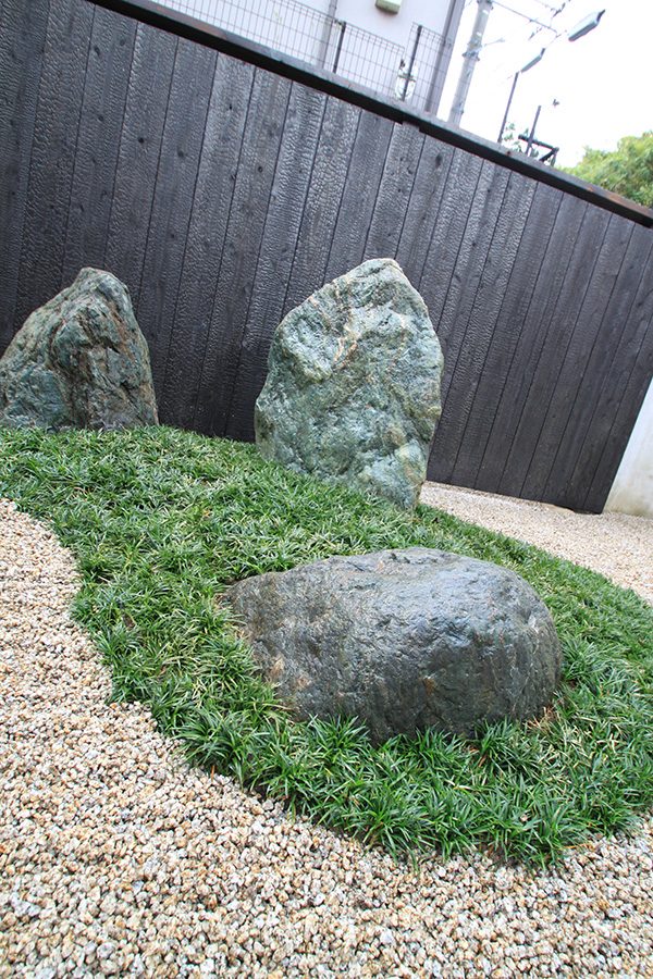 全面防草シート敷きにして、その上に庭を組んでいます。石組みはリビングを正面にして組み、サビ砂利を敷き砂紋を引いてシンプルな構成です。背景を焼杉板塀として現代住宅にも合う、モダンなデザインで大変喜んで頂き、また道行く人々からも見える空間なので近隣の方々にも楽しんで頂ける空間になりました。