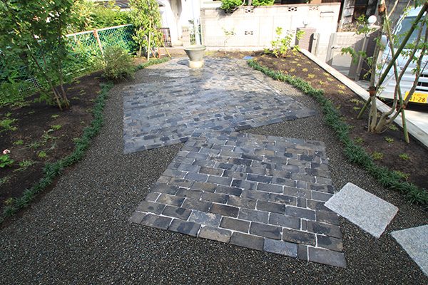 共働きで忙しく、あまりお庭のお手入れが出来ないので、植物は最小限にとの事でした。デザインも全てお任せいただけたので、和のテイストを入れた構成で現代住宅にも合う、黒レンガを使ったスタイリッシュな四角形を重ねたデザインにしました。アプローチは白御影石で仕上げました。既存の松や石、石造物などは再利用しています。