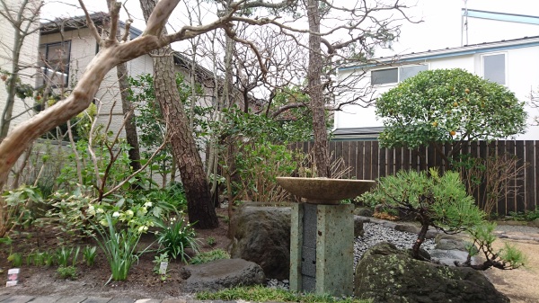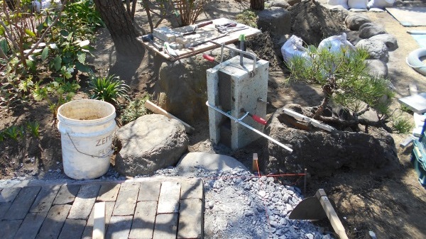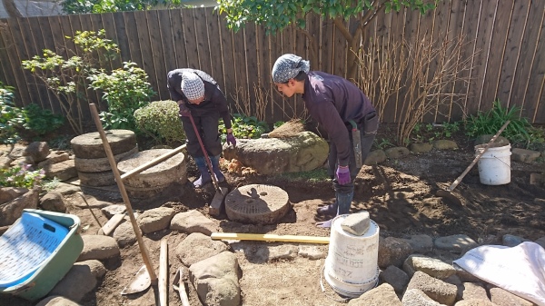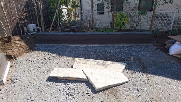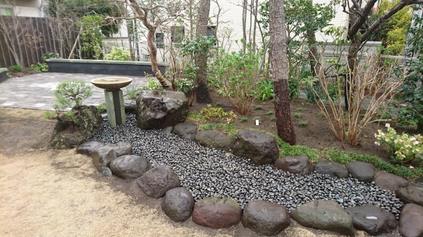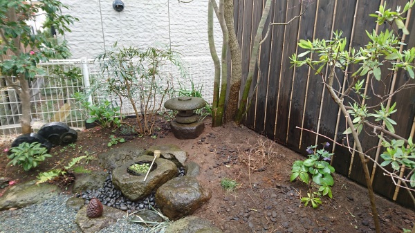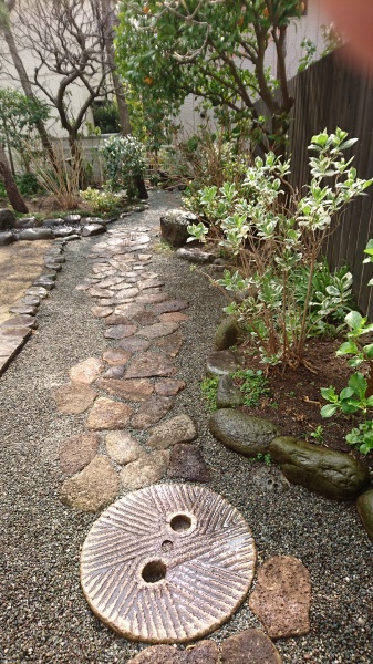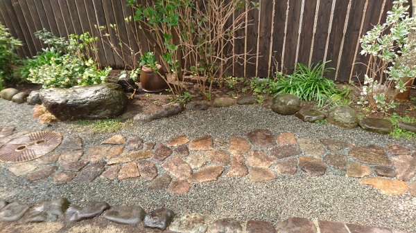 No.194 野鳥の集まる庭 錆び御影石 大谷石 黒レンガ 版築