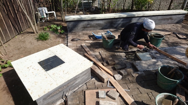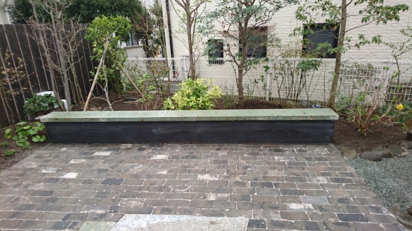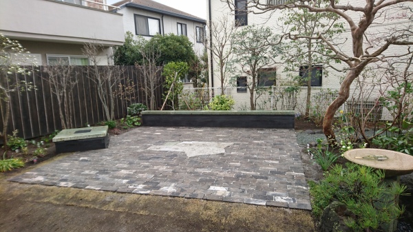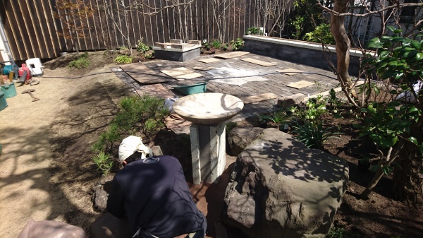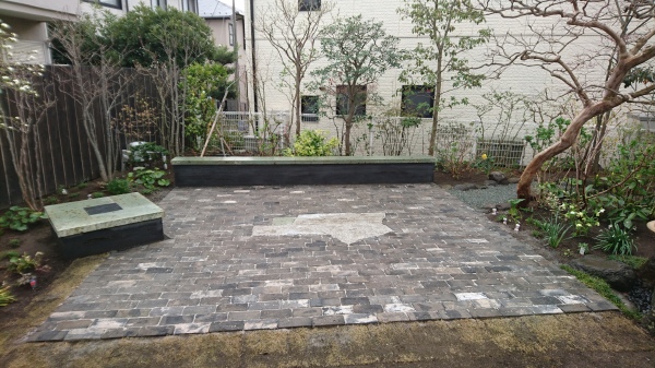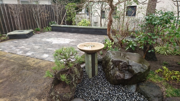 今までは、お庭に一体感が無かった為、お庭を回遊できる設計にしました。 テラスの面積を大きく取り、当社オリジナル版築ベンチはデザイン兼BBQ時にはテーブルとしても使用できます。また、井戸を生かし、飲み物や食材などを冷やして使えるように、錆御影石のバードバス(水盤)を設けました。野鳥も訪れるようになり、大変喜んで頂きました。