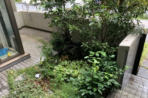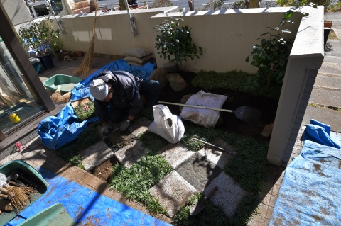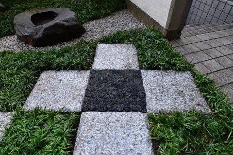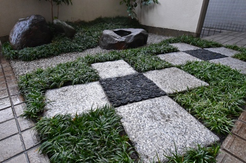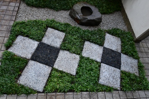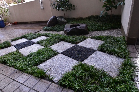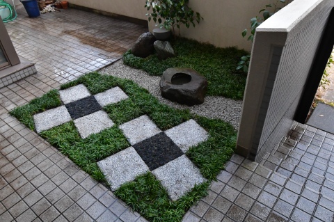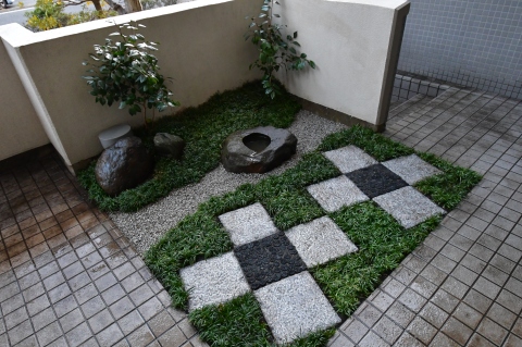 白御影石(みかげ石)と菊炭を使用し、市松模様にデザインしました。マンションの専用庭のような、たとえ僅かな敷地(一坪)でも、充分変化にとんだ空間づくりは可能です。 限られた条件の中で「和を感じる庭」がご希望でしたので、現代住宅にも合う、モダンジャパンスタイルの庭で日々の暮らしの中で、日本の伝統美を感じて頂ければ嬉しいです。