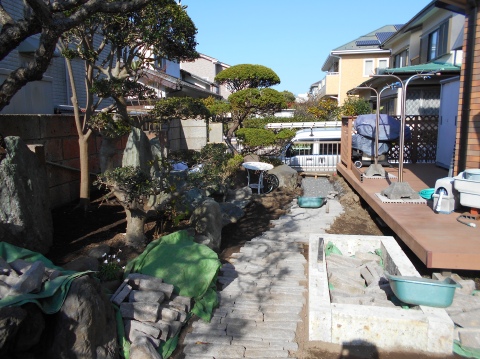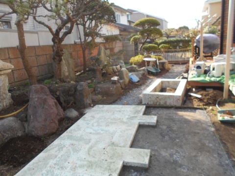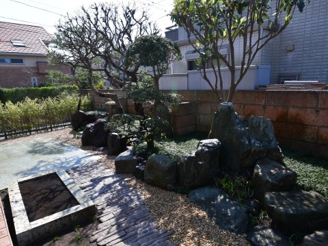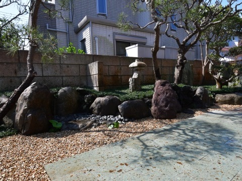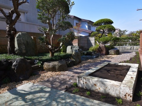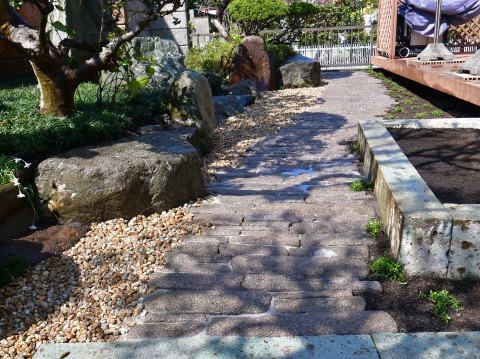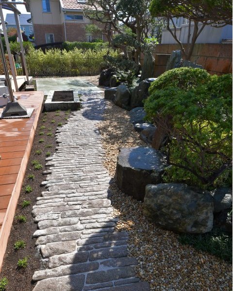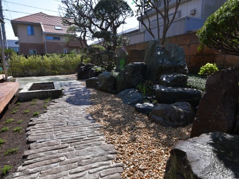 神奈川県では、最近良くあるご相談で、昭和の頃に流行した群馬県の青石の撤去を含めた作り替えです。 全て撤去するのではなく、組み直して、再利用できるものはプランに取り入れています。 野菜を育てながら、バーベキューを楽しみたいとのことで、大谷石テラスをメインに、 アプローチは丹波石でデザインしました。ご希望通りの空間になり、大変喜んで頂きました。