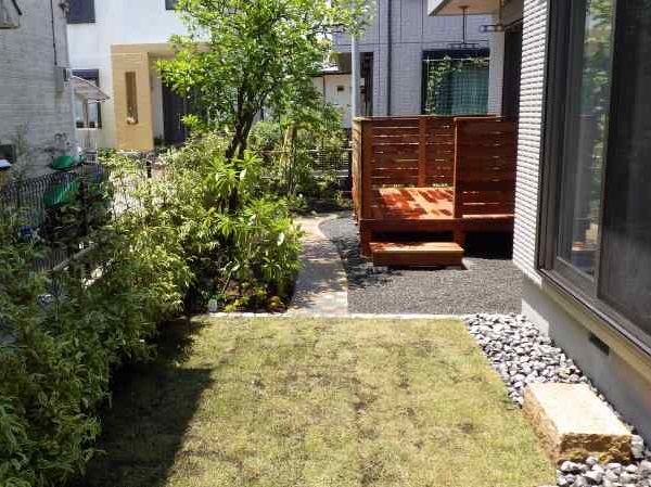 耐久性を考え、セランガンバツでウッドデッキを作り、真砂土のアプローチはナチュラルなイメージで、石材をポイントにしました。 宿根草を植えたので、毎年時期が来たら、庭を彩ります。 立水栓は石材と木材の組み合わせでデザインしました。オンリーワンな庭に仕上がり、大変喜んでいただけました。