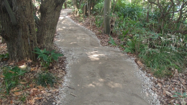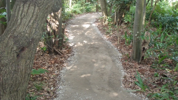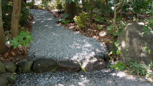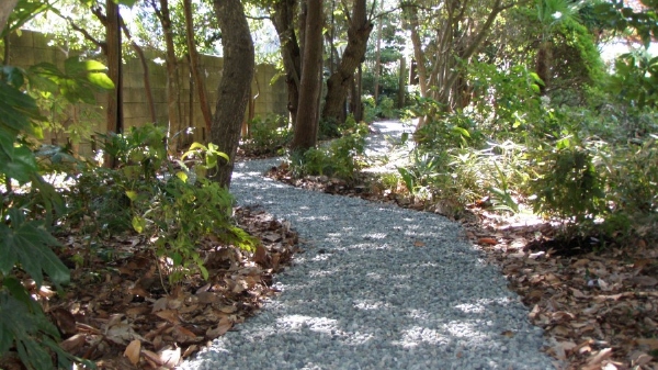 砂利が沈まないように、大地は砕石で転圧しています。 木々の間から木漏れ日が差し込み、歩いているだけでも楽しくなるアプローチになりました。