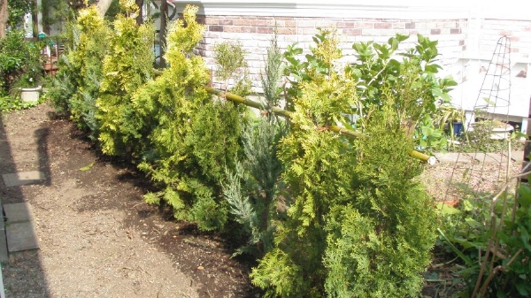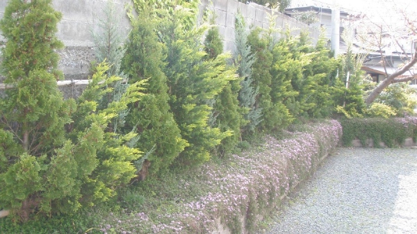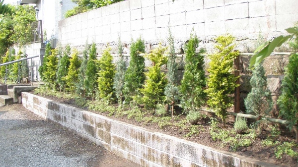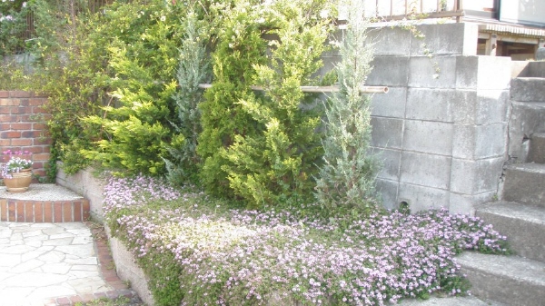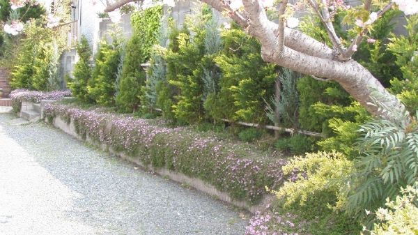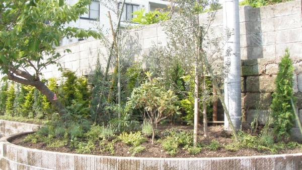 輸入住宅にも合うように、コニファーやオリーブを中心とした植栽プランでご提案させていただきました。 グランドカバーはハーブを植え、花が多く咲くお庭になりました。