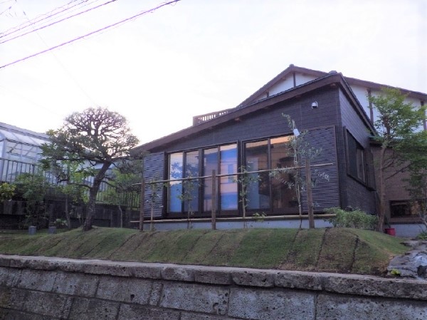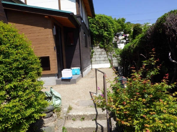 アプローチは大谷石と真砂土の洗い出し仕上げで、鎌倉の街並みにも調和するように、天然素材でデザインしました。 地盤が高いので、あえて敷地周りは囲わずにオープンにし、芝で土留めをしています。