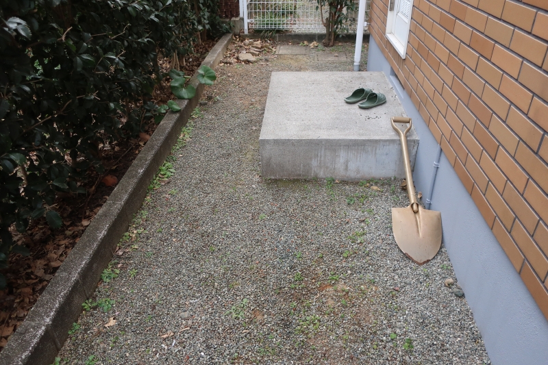 雑草に負けて消えてしまった芝の貼り替え、防草シートと砂利敷き、庭の入口に階段を設置してほしいとのことでした。