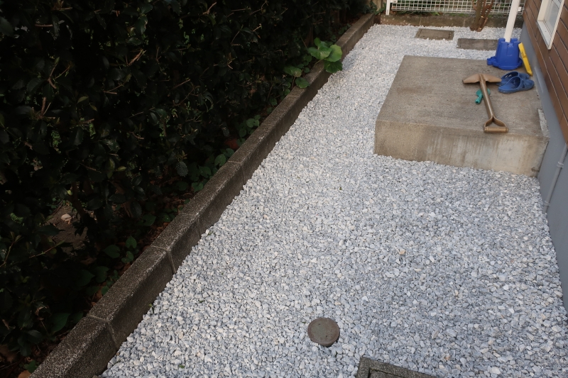 No.224 芝の貼り替え、防草シート・砂利敷き、石のステップ設営