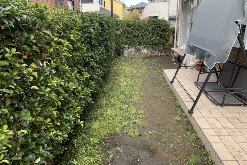 夏にお子様と芝でプールを楽しめる、雑草対策、庭は室内からしか出入り出来ず外からの出入り出来るように、 生垣を抜き、石のステップを設置することをご提案させていただきました。