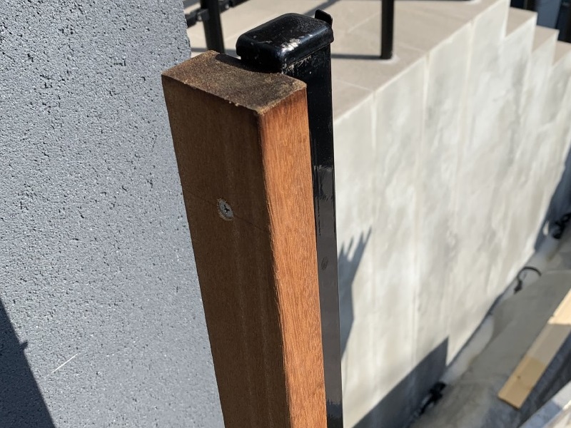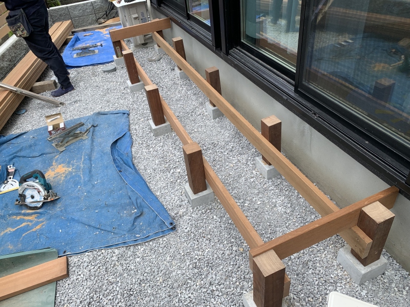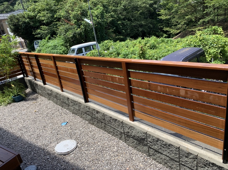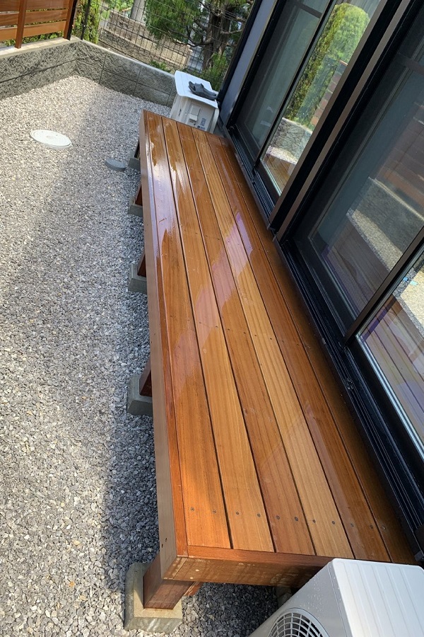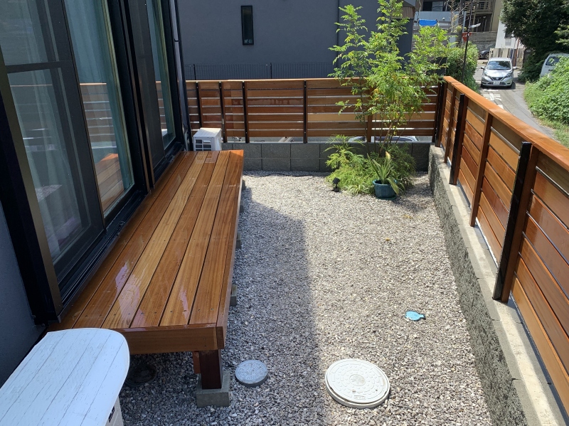 腰掛けくらいの寸法のウッドデッキをご提案させていただき、既存フェンスの柱を再利用して、ウッドフェンスを組み立てました。 セランガンバツ材を使用したので、耐久性があり長く楽しめることでしょう。