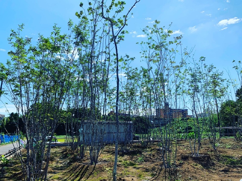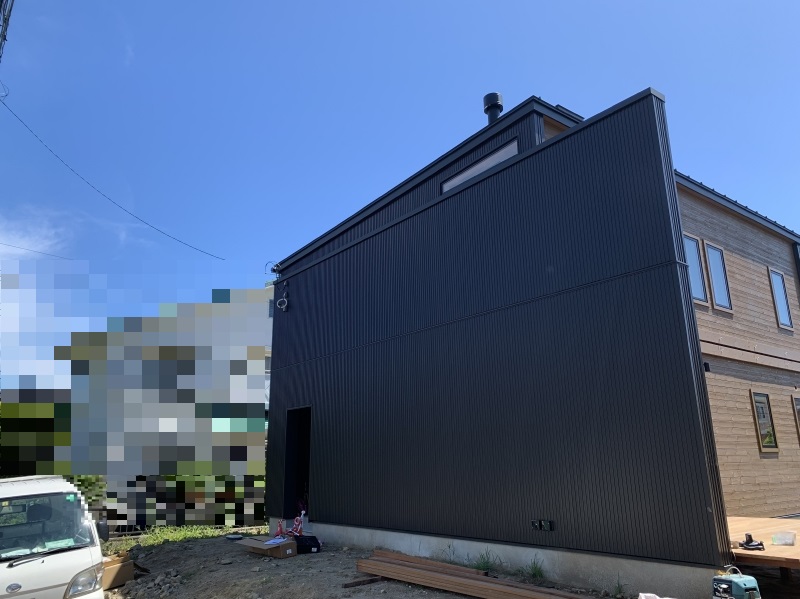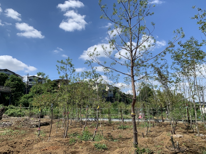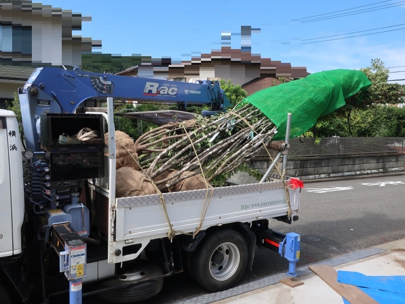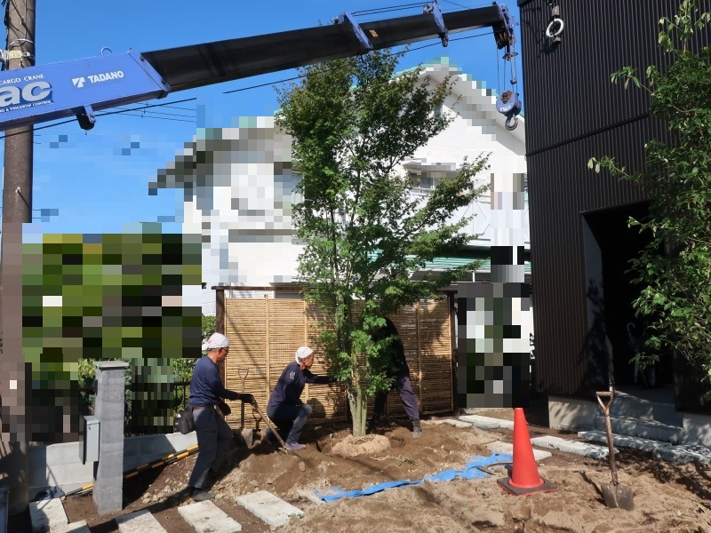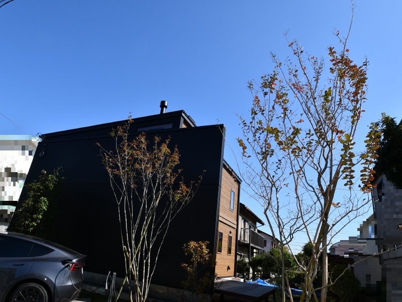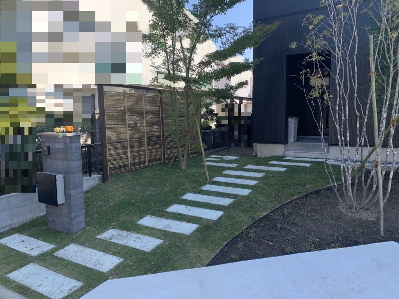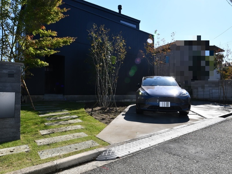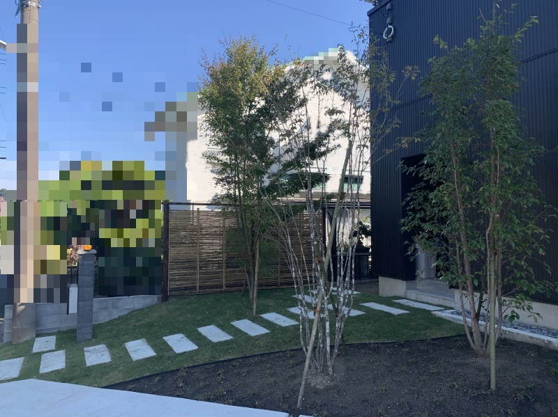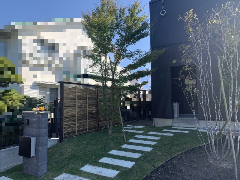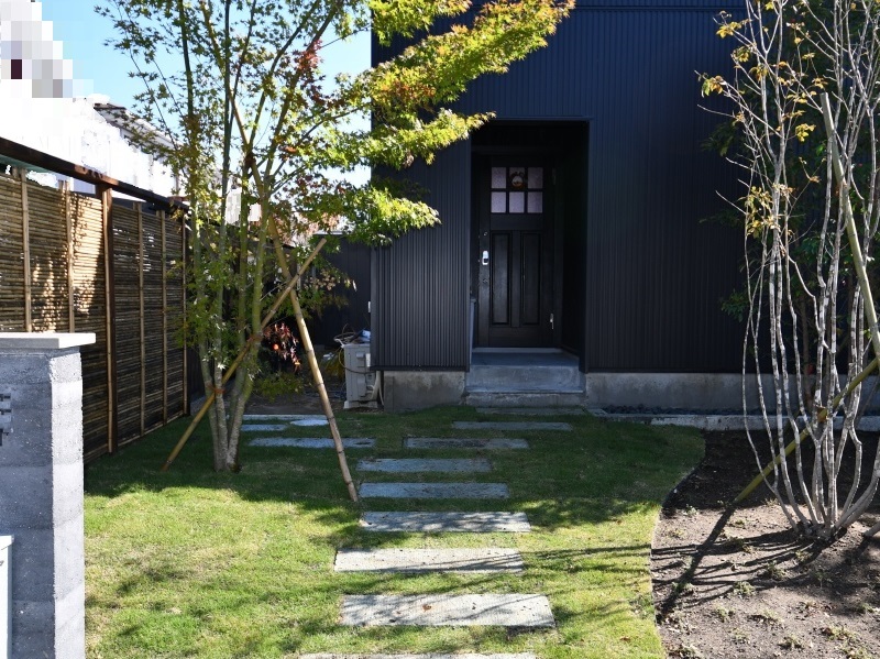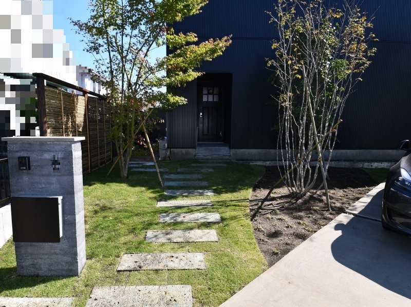 2台駐車が前提で、庭のイメージや好みを伺い、あとはお任せいただきました。 ハウスメーカーでは2台分の駐車スペース確保は出来ないと断られましたが、米山庭苑では絶妙な角度のデザインと勾配により 2台駐車可能にしました。建物に負けないサイズの大きなモミジ、アオダモ等の雑木を中心に植栽しました。 黒のオリジナル版築門柱は黒ガルバニウムの外壁にもマッチしています。大谷石のアプローチや竹垣、版築など 当社の豊富な現場施工での経験を活かした和モダンなデザインで、建物に合う外部空間に仕上がりました。