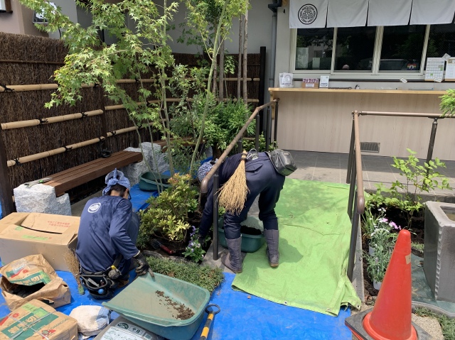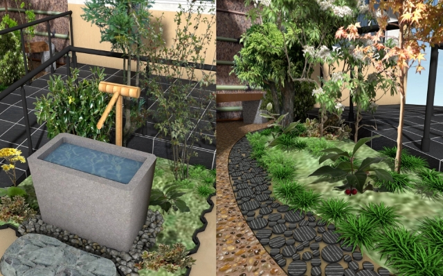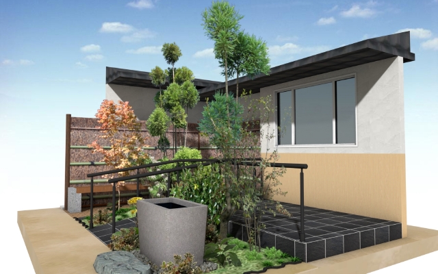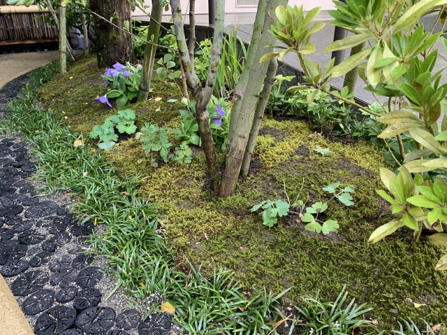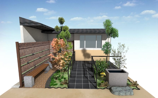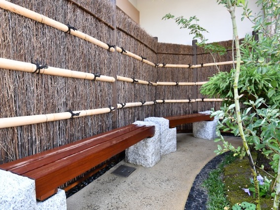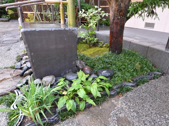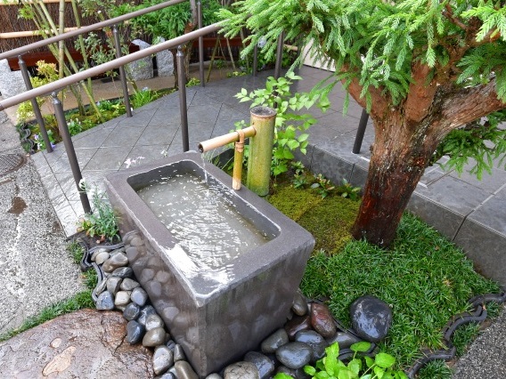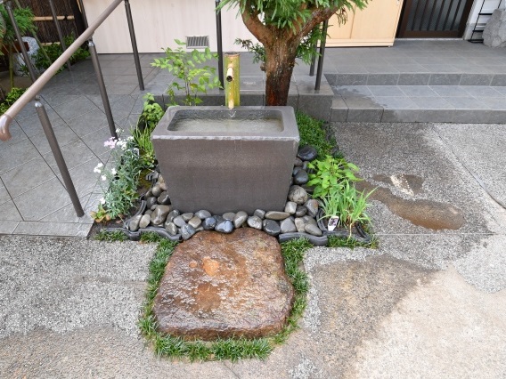 お寺を訪ねた人々が一休みできる腰掛を設け、入口は北山台杉がシンボルツリーとなり、季節を感じられる宿根草を多く植えました。 小松石の手鉢で清め、気持ちよくお参りしていただけることでしょう。