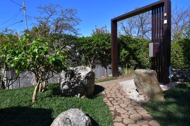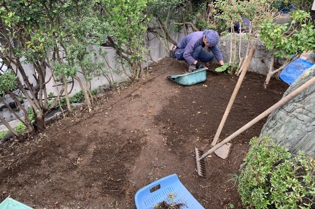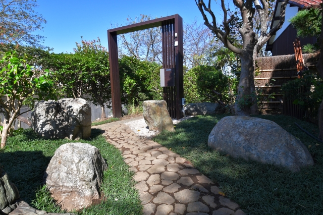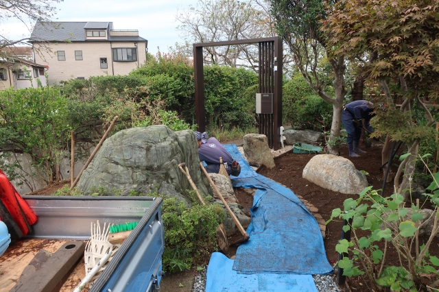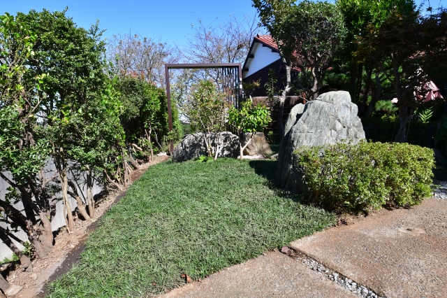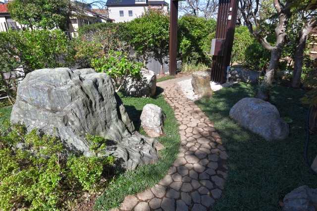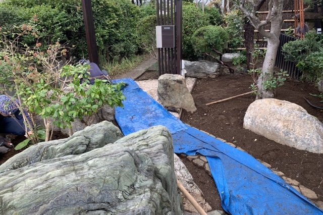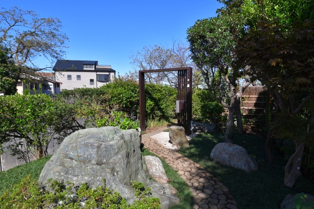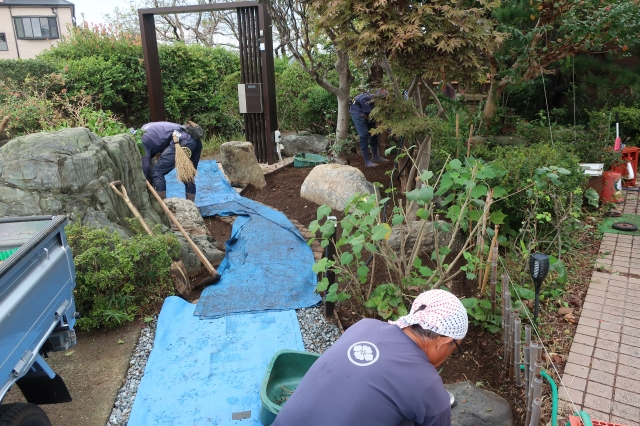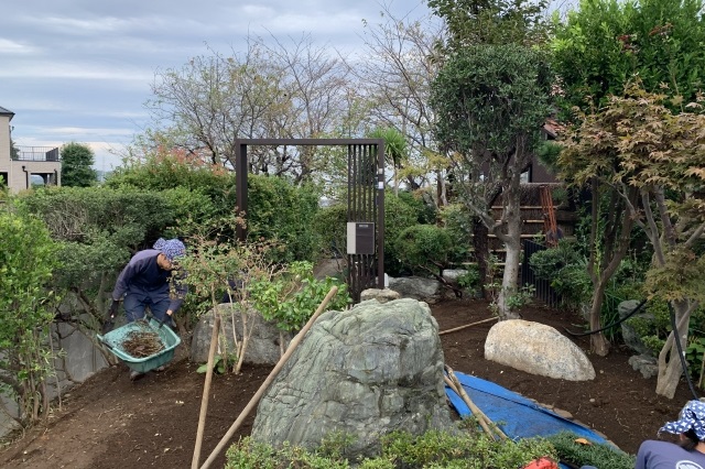 まず、古い木々を整理し既存の石を再利用し、古民家に合うように、グランドカバー(玉竜)と低木、景石のみでシンプルに構成し、 古民家との相性の良い黒穂垣を設置しました。大変喜んでいただけました。