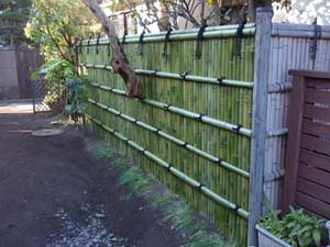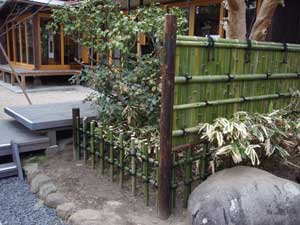 前回は穂垣でしたが、今回は建仁寺垣にしました。既存のザクロを切らなくてもいいように、垣根を細工しています。