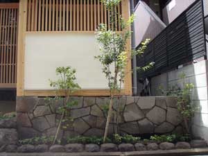 工事を開始して暫くして、あの3.11の震災が起き、燃料も満足に給油できない状態で重機が使用できず大変でした。 手の込んだ「こだわりの空間」をという事で、外壁も既存のブロックを生かし版築工法で化粧しました。 それに合わせて門柱も土で制作し、オリジナリティーを出しています。 石材は石積に神奈川の赤ボサ、壁泉に小松石を使用し、水を景色に取り入れました。 リビング前は、外壁とは土と配合を変えたやわらかい土壁を背景に、特注のガラス製の鉢から水が湧きあふれます。 小さなお子様もいらっしゃいますので、石積みの壁泉からあふれた水を下に溜めれる様にして、夏は水遊びが楽しめます。 今まで何十年も使用されていなかった井戸をポンプでくみ上げ、復活させましたので水は冷たく気持ちがいいです。 また、主木のモミジは山堀りの木で、柔らかくいい雰囲気です。 これから、木々が根を張り下草類が増えてきますと、更に良くなる事でしょう。