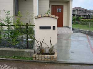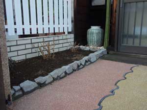 車庫のコンクリート打ちと、カーテンゲートの取り付けのご依頼でしたが、アプローチと玄関周りも遊んでみました。