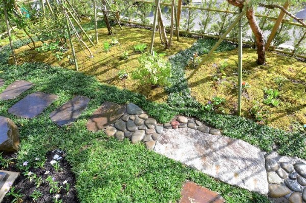 まず、古い木々を整理し既存の石を再利用し、古民家に合うように、グランドカバー(玉竜)と低木、景石のみでシンプルに構成し、 古民家との相性の良い黒穂垣を設置しました。大変喜んでいただけました。